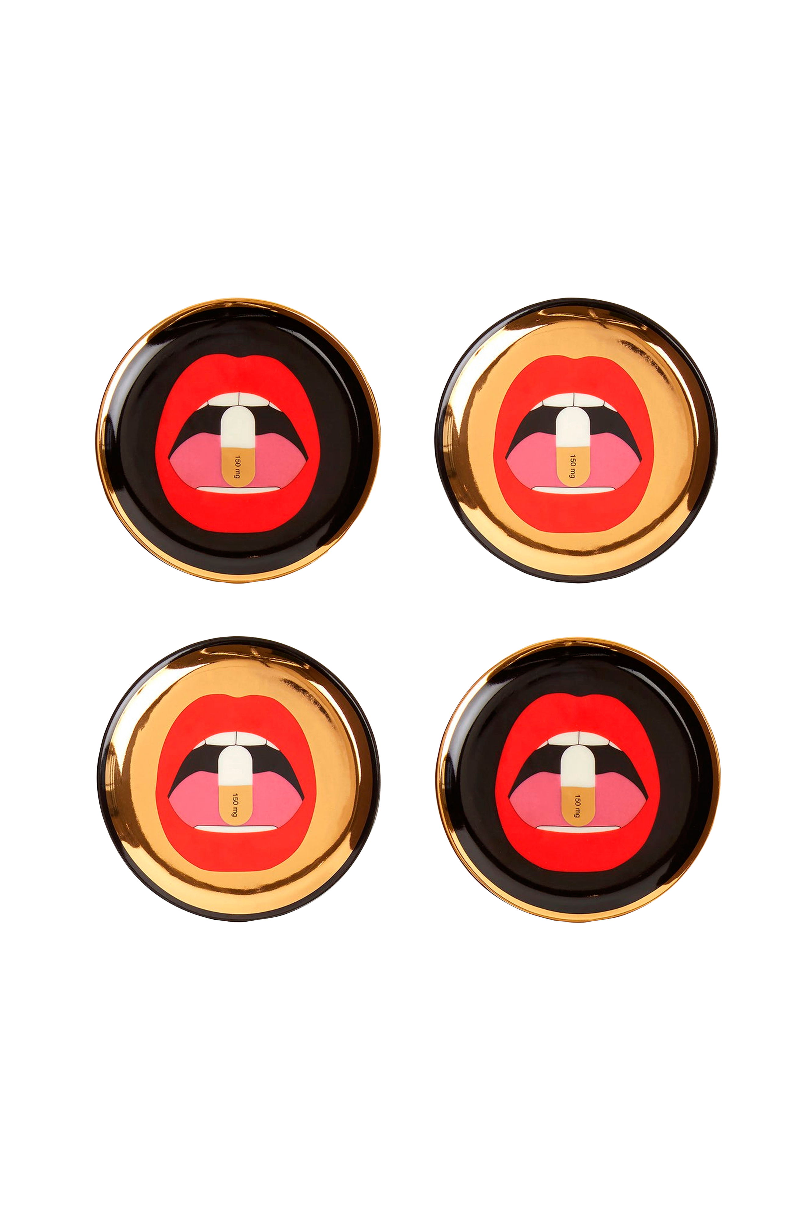 Full dose underlägg piggar upp alla dagar i veckan med sin lekfullhet. Används som underlägg till glas eller som en kul detalj vid en dukning. Material är keramik med guldetaljer. Måttet är 10 cm diameter och underläggen ligger om 4 st i en lyxig presentförpackning. Endast diskning för hand.
