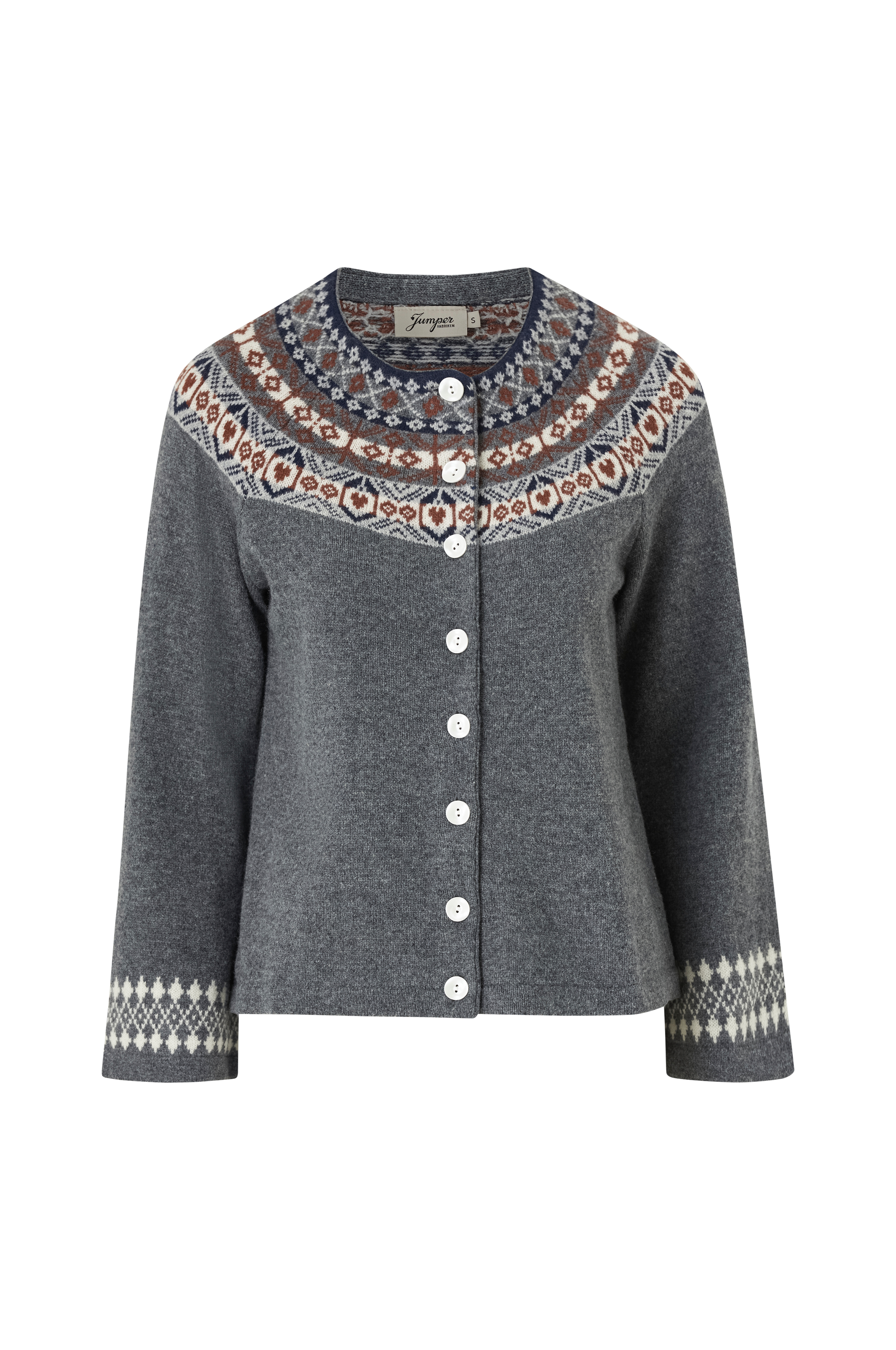 • Rak modell med mönsterstickning upptill• Lång, utsvängd raglanärm• Dekorativa knappar fram