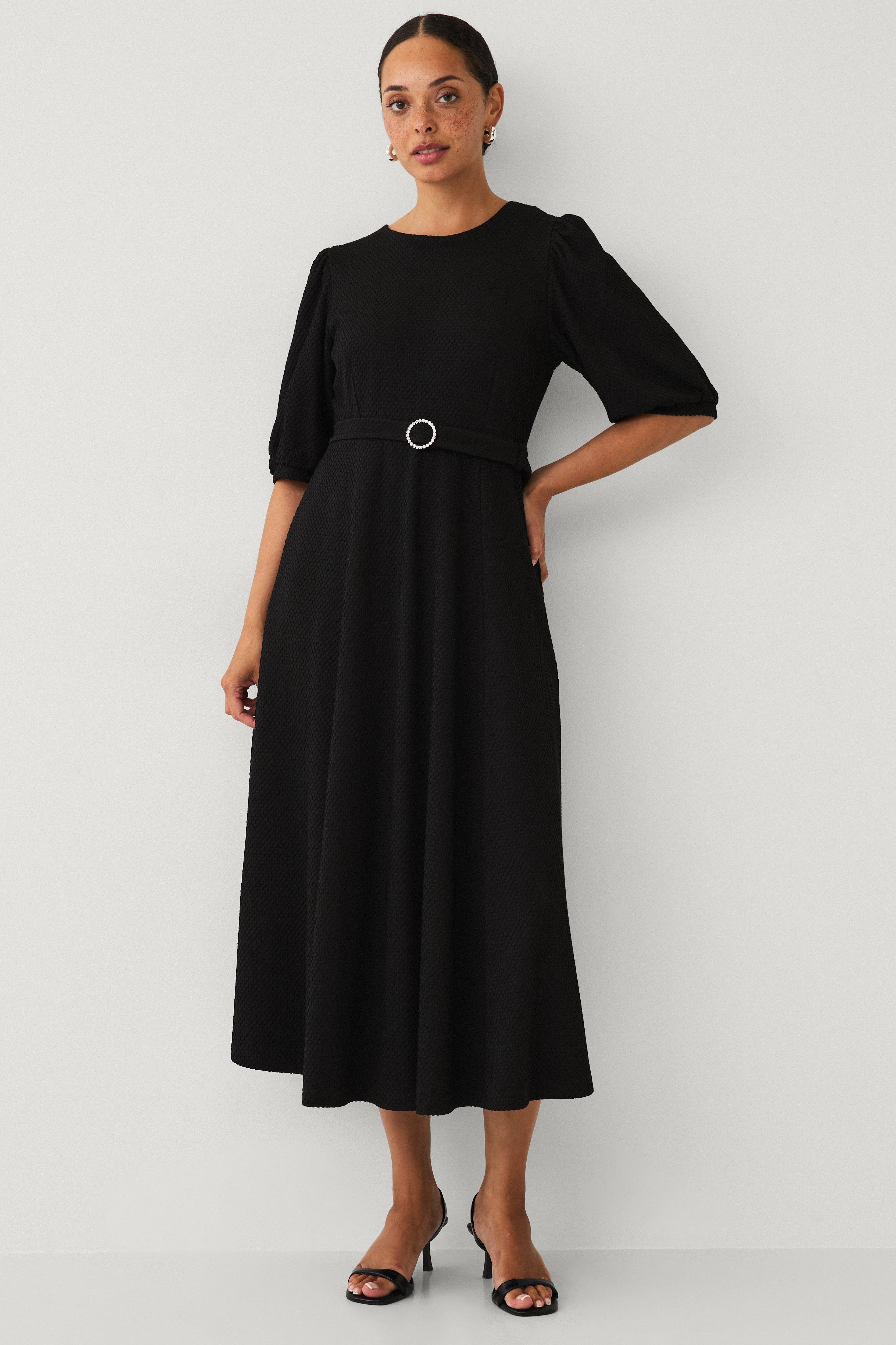 • Mjuk klänning i viskosmix• Rund halsringning• Nyckelhålsöppning bak• Korta puffärmar• Markerad midja med avtagbart bälte• Utställd nederdel• Normal passform• Längd: 128 cm i storlek S