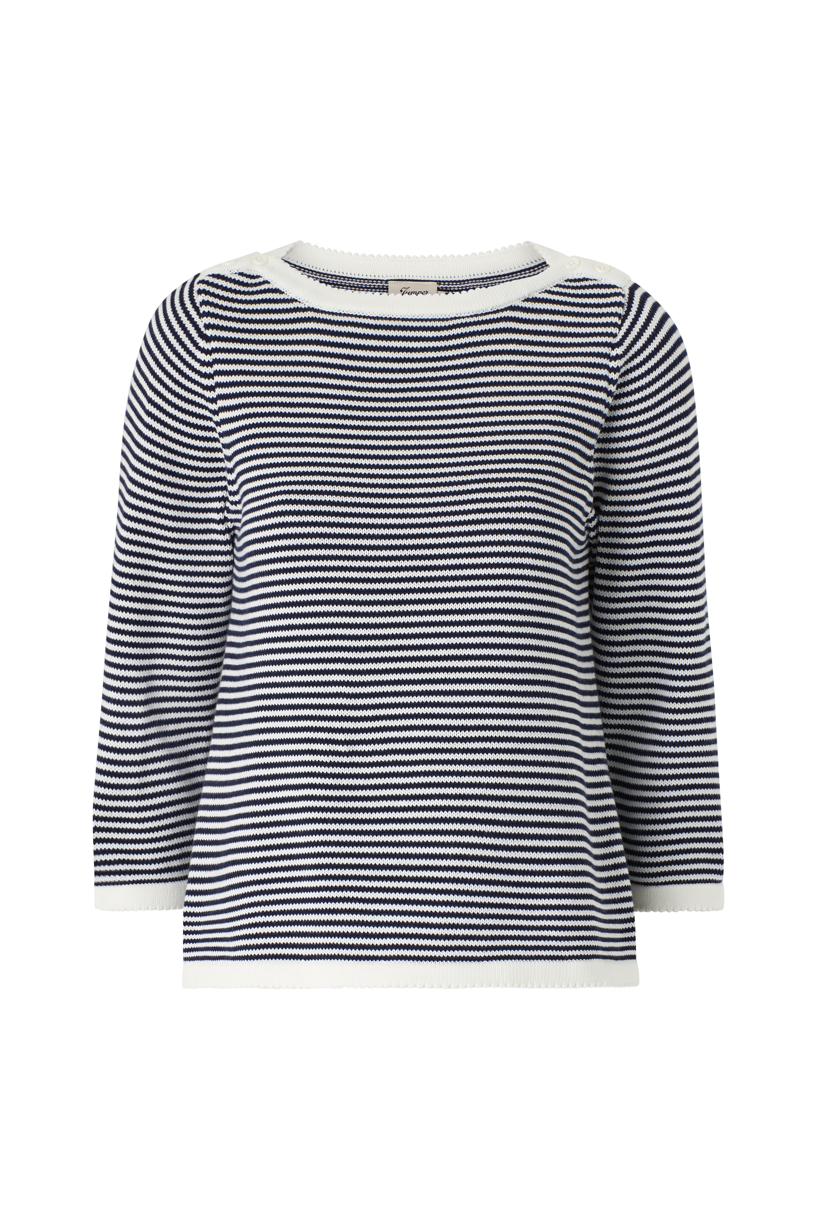 • Stickad, randig tröja i bomull• Rak passform• Rund halsringning• Dekorknappar på axlarna• 3/4-långa ärmar