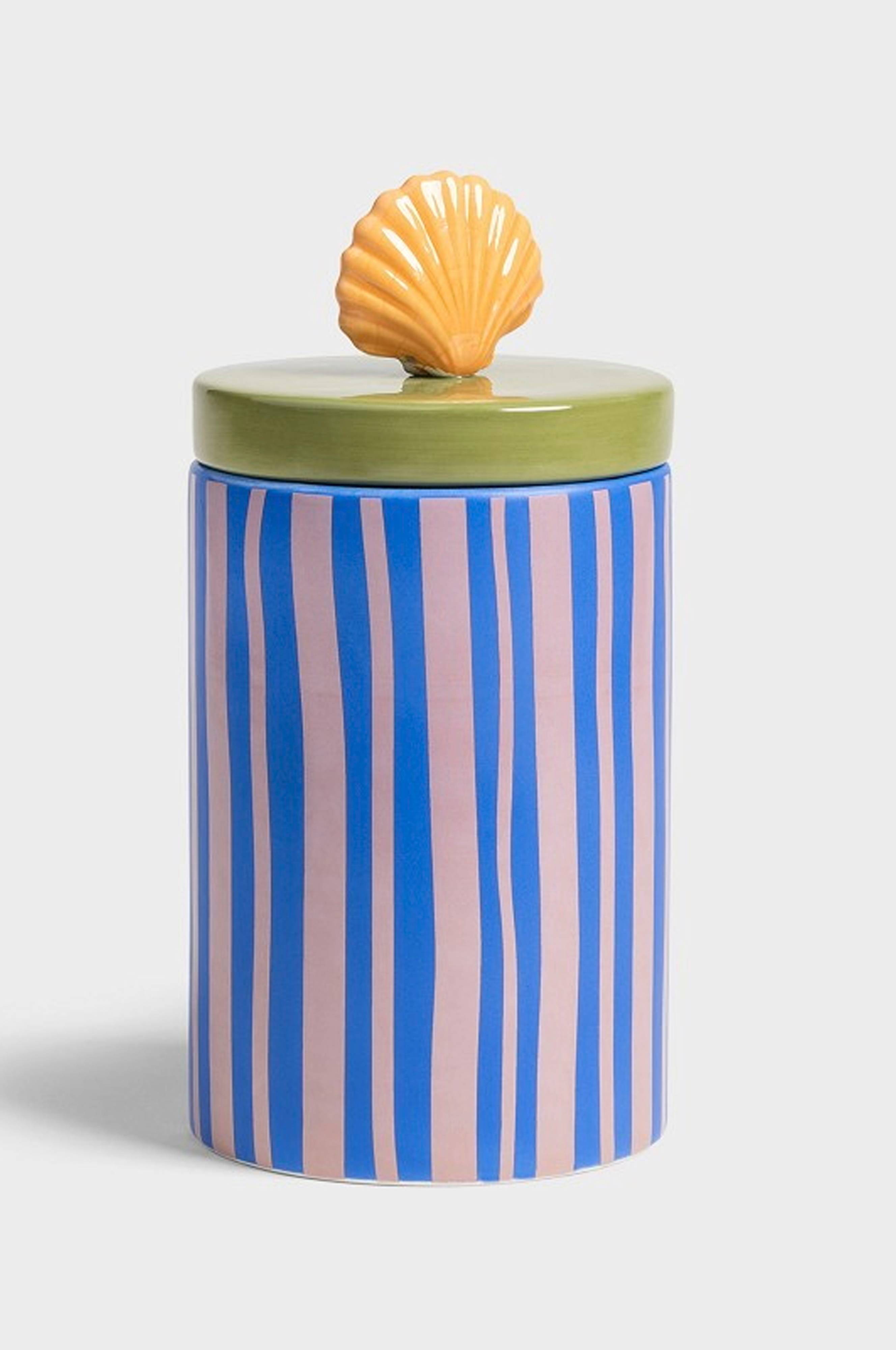 Denna färgglada burk är designad för att ge en glad touch till varje dukat bord eller köksbänk. Ett färgstarkt lock som har ett skal som ger burken dess funkiga utseende. Burken kan även användas för att förvara godis eller andra småsaker. Handdisk rekommenderas. Material: Dolomit.
