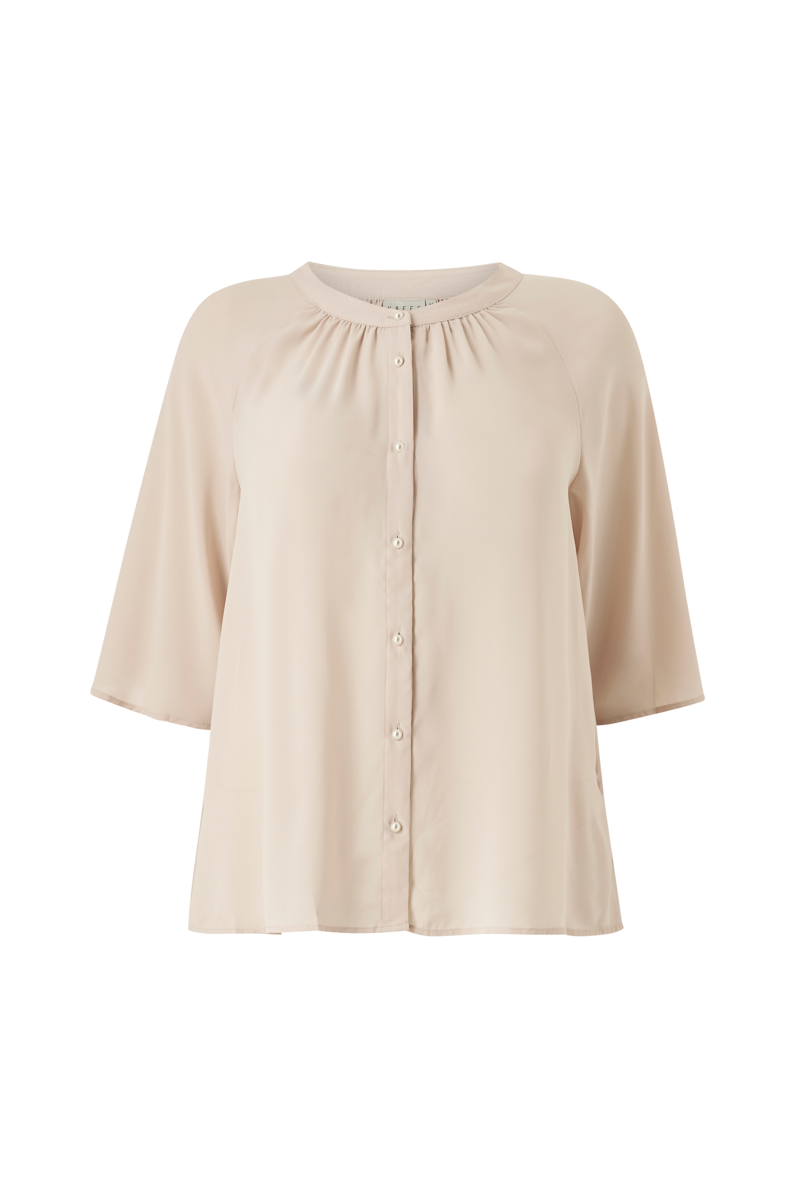 • Plusstorlekar• Rak modell• Rund hals med rynk• Pärlknappar fram• Vid, halvlång raglanärm