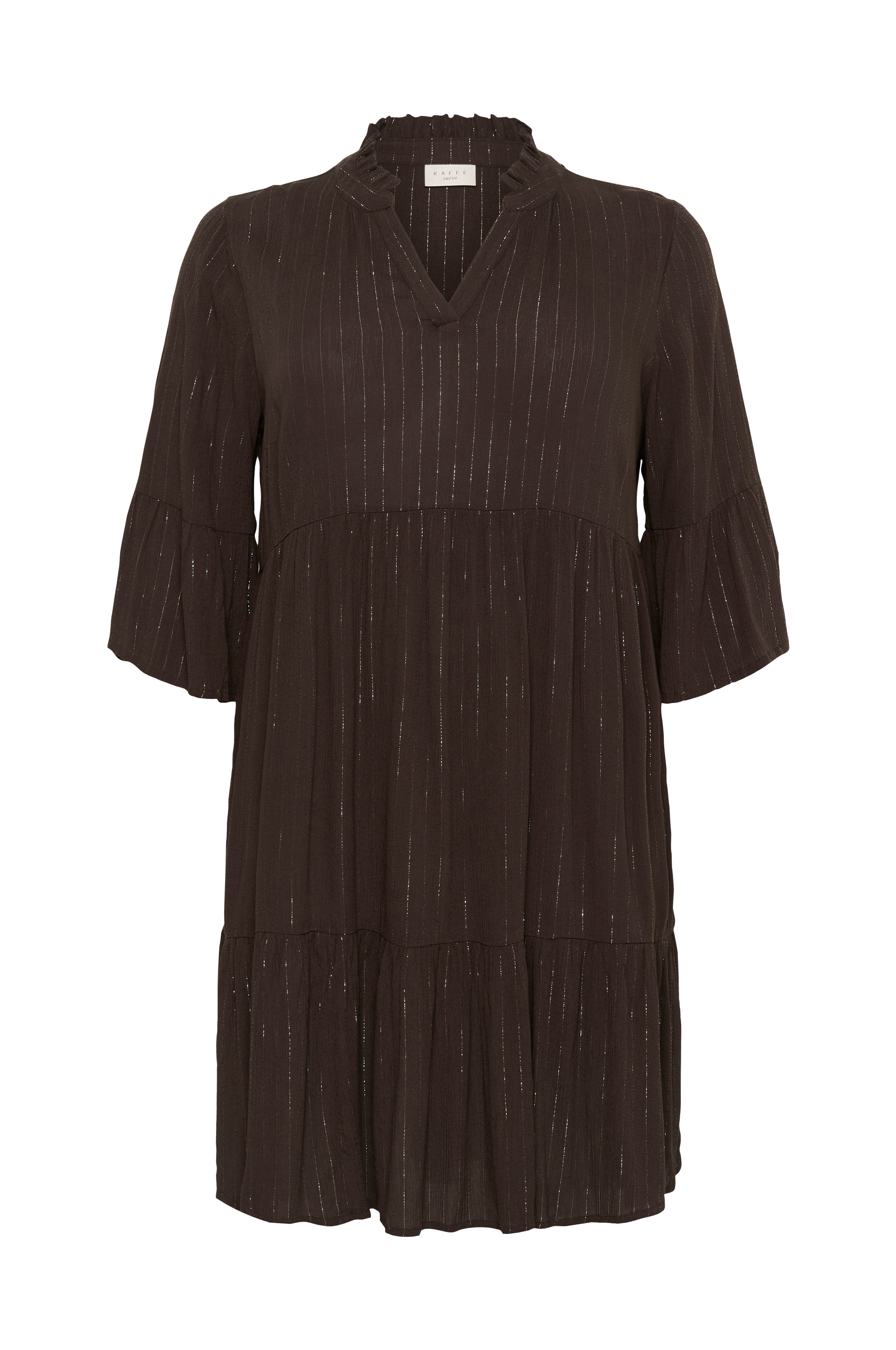 • Plusstorlekar• Utsvängd modell med glittriga ränder• Volang runt nacken med v-ringning fram• Utsvängd ärm• Markerad midja• Bred volang i nederkanten• Längd: 104 cm i storlek 44