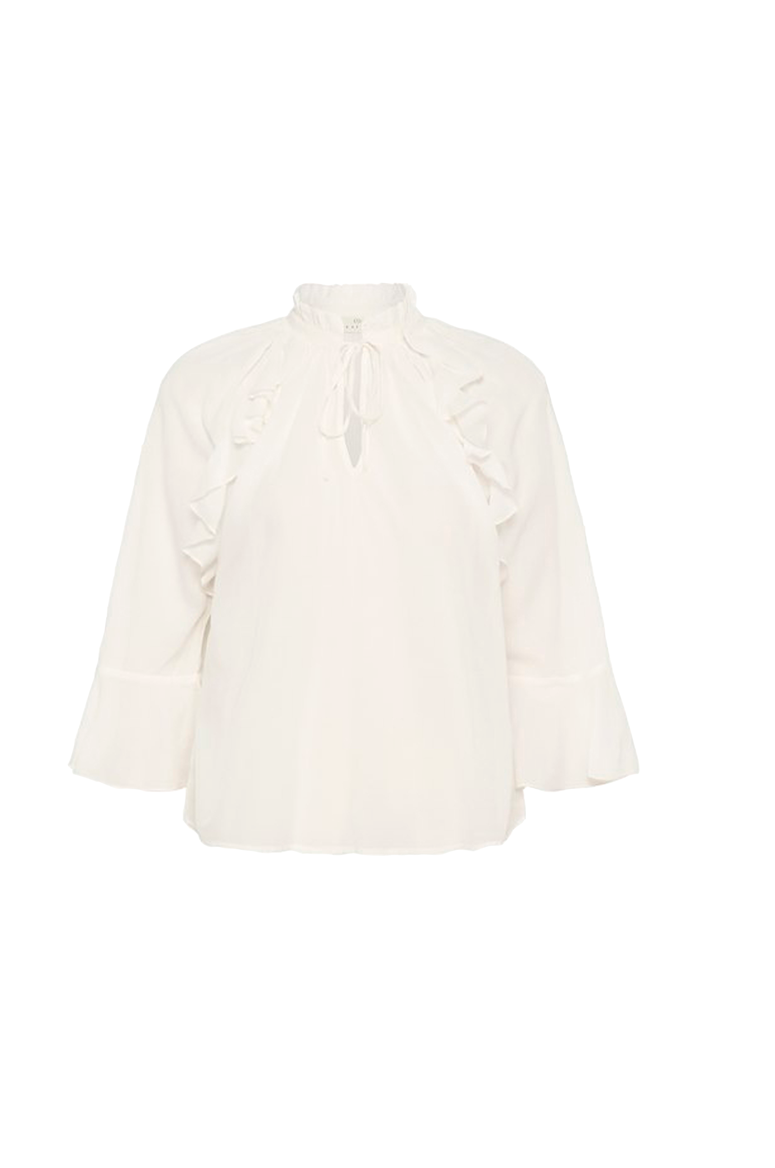 • Semitransparent blus i viskosmix• Volangdetaljer runt halsen, över axlarna och i ärmsluten• V-ringad hals med knytband upptill• 3/4-långa ärmar• Lös passform