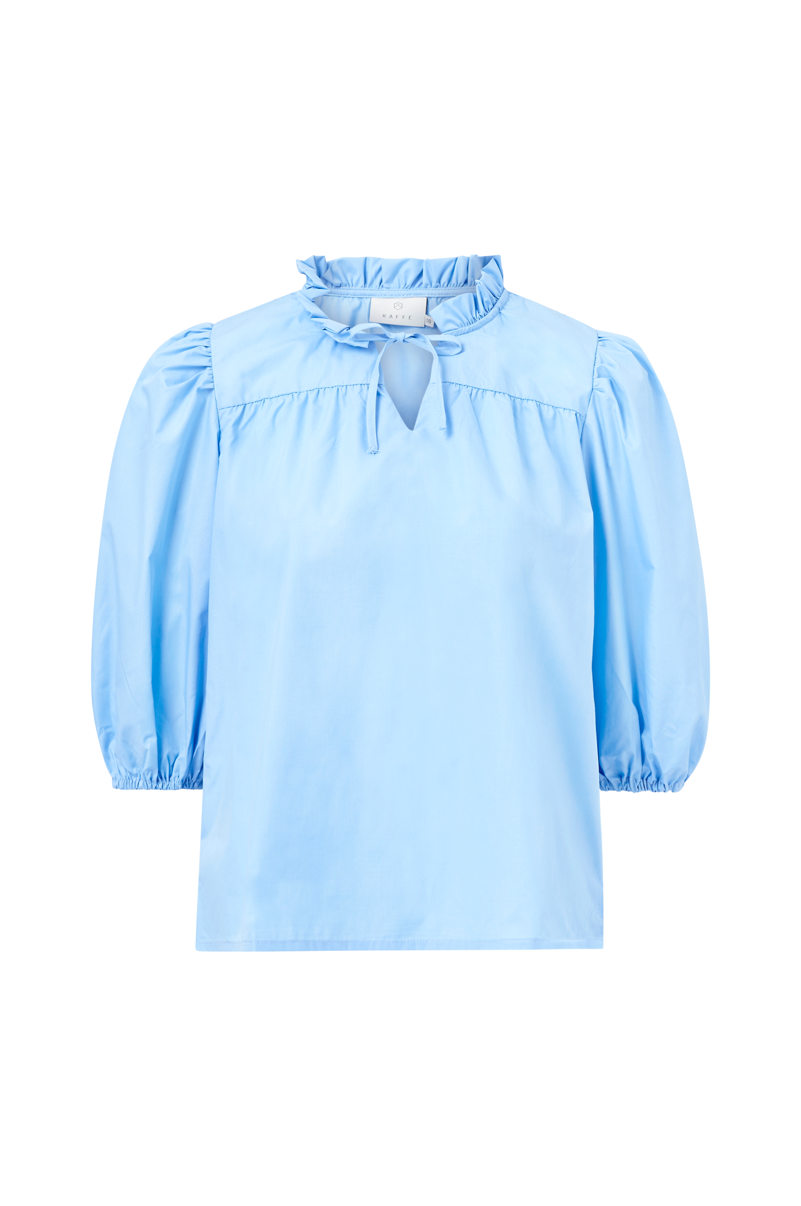 Rak modell med ledig form som har avskärning med rynk på bröstet. Volangkant i halsen och sprund med smalt knyt fram. Vid, 3/4-lång puffärm med rynk vid axeln och infälld resår i ärmslut.