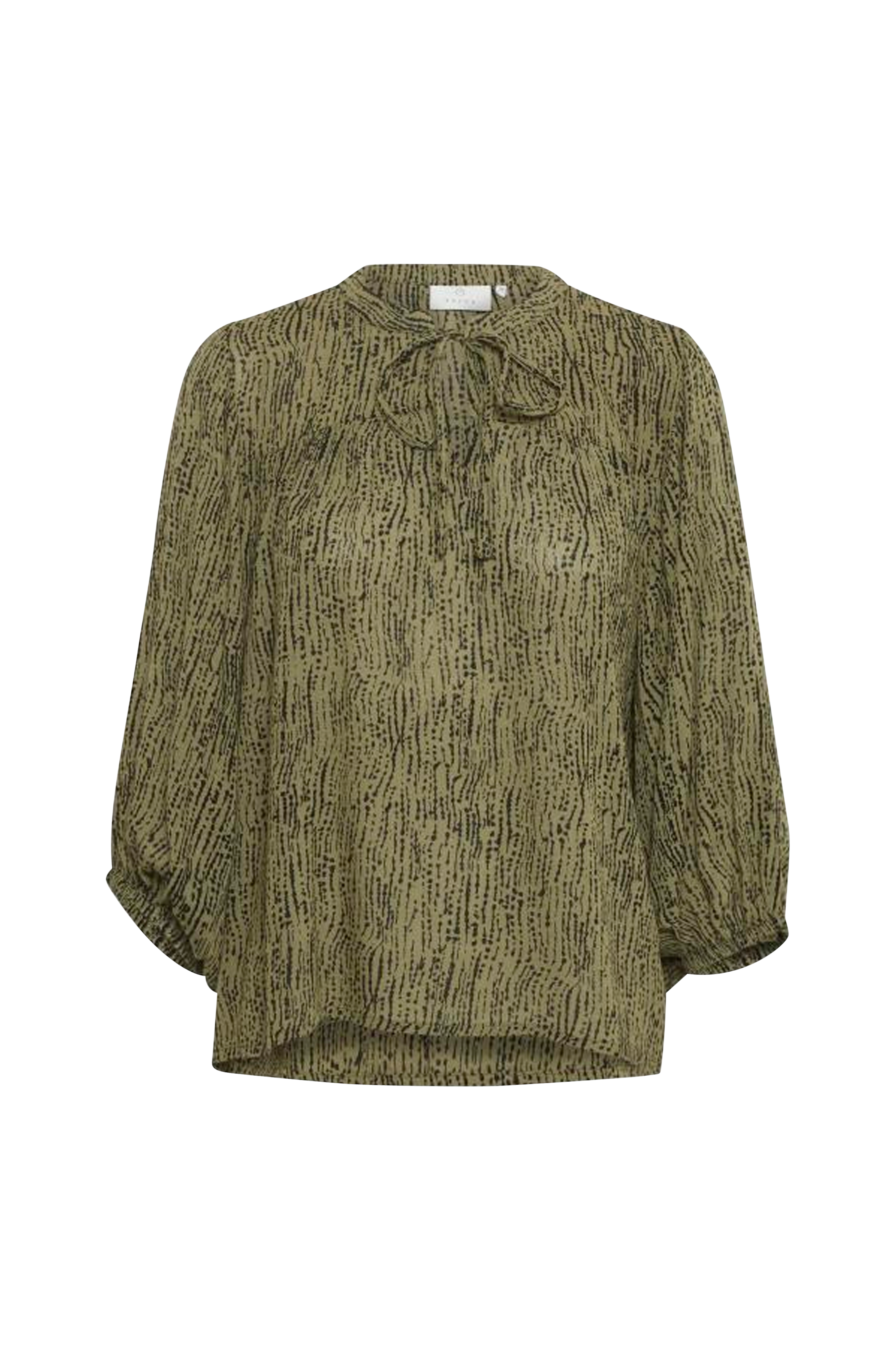 Blus i vävd viskoskvalitet med fint fall. V-ringad hals med knytband. Vida ärmar med resår i ärmsluten.