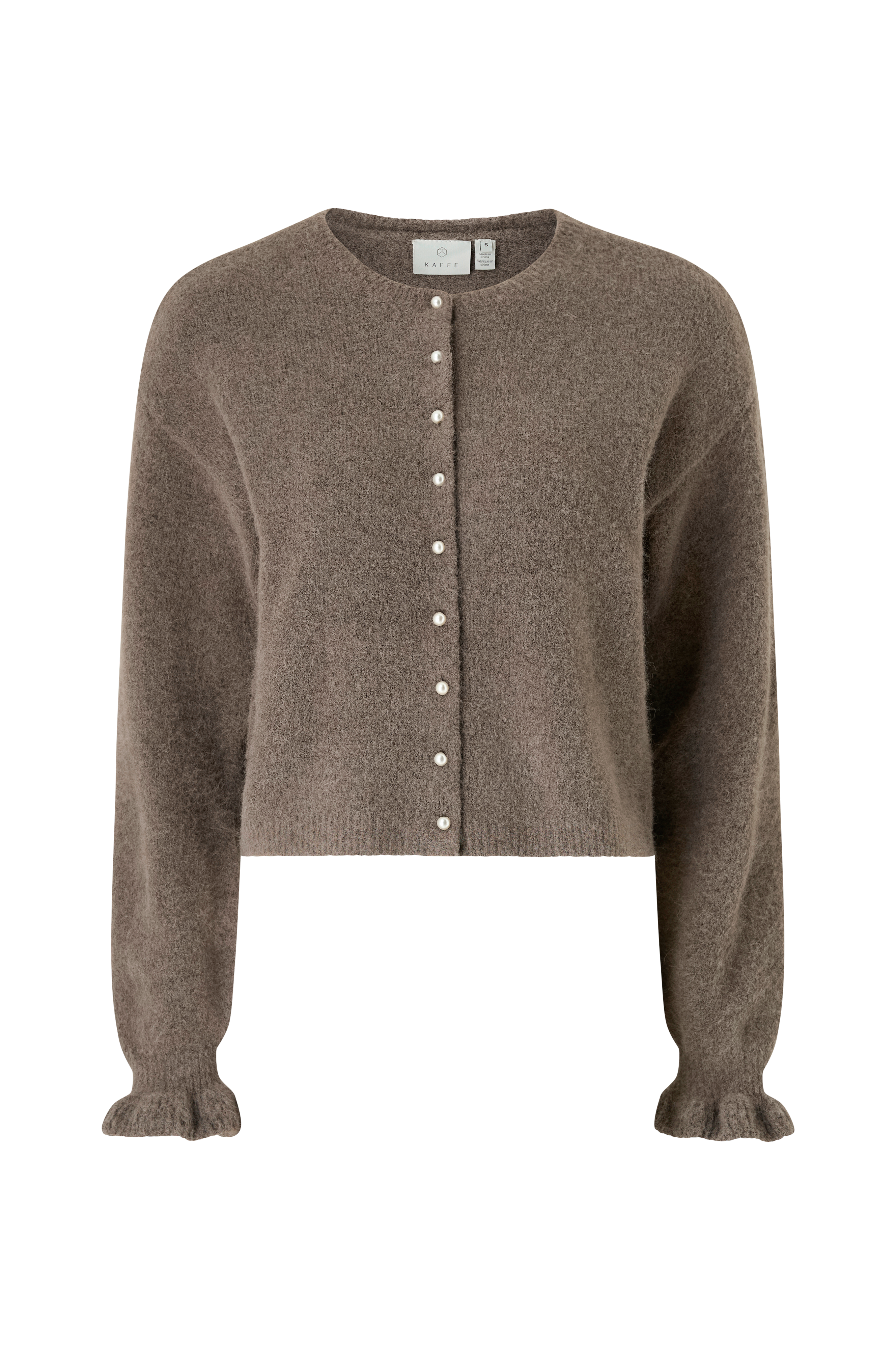 • Långa ärmar med ribbstickade volanger i ärmsluten