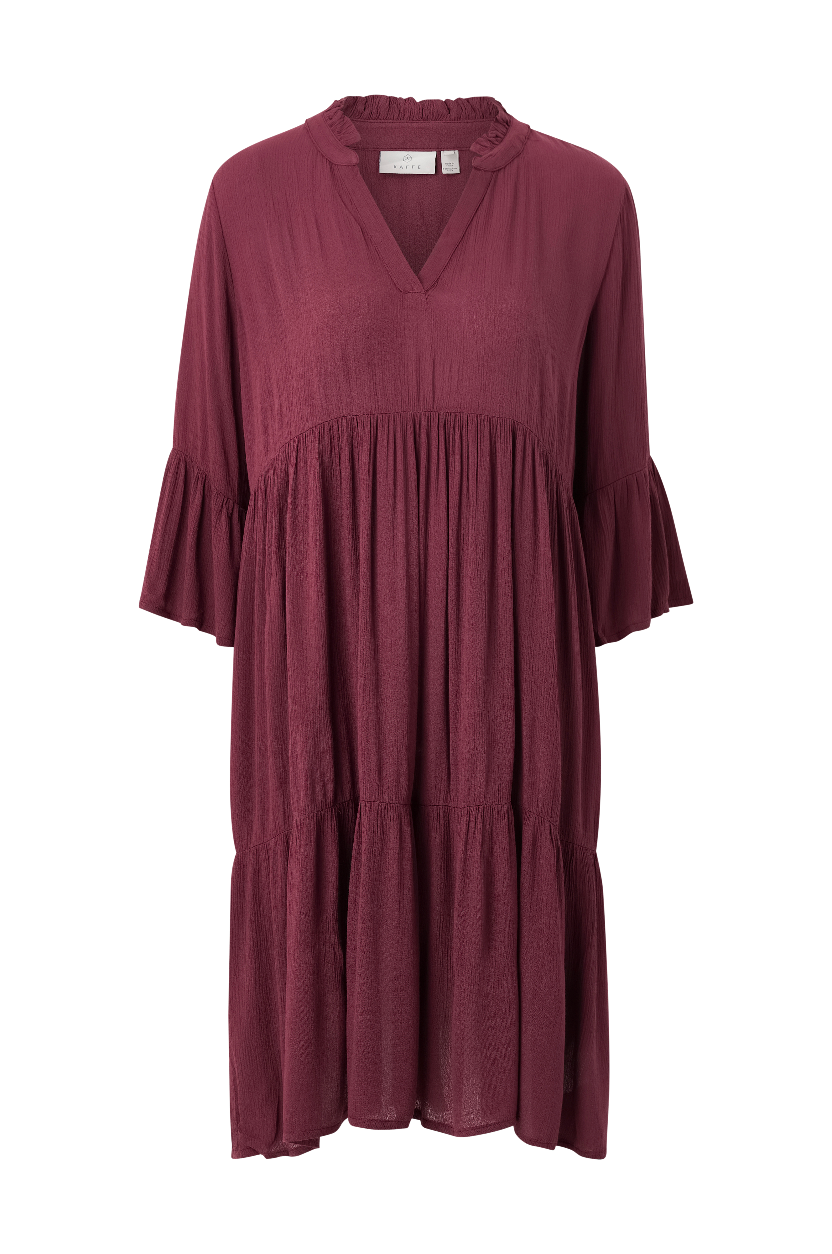 • Klänning i viskos med avslappnad passform• Hals med volangkrage• 3/4-långa ärmar med volang i ärmsluten• Avskärning i midjan med rynk och volang i nederkanten• Längd: 104 cm i storlek 36