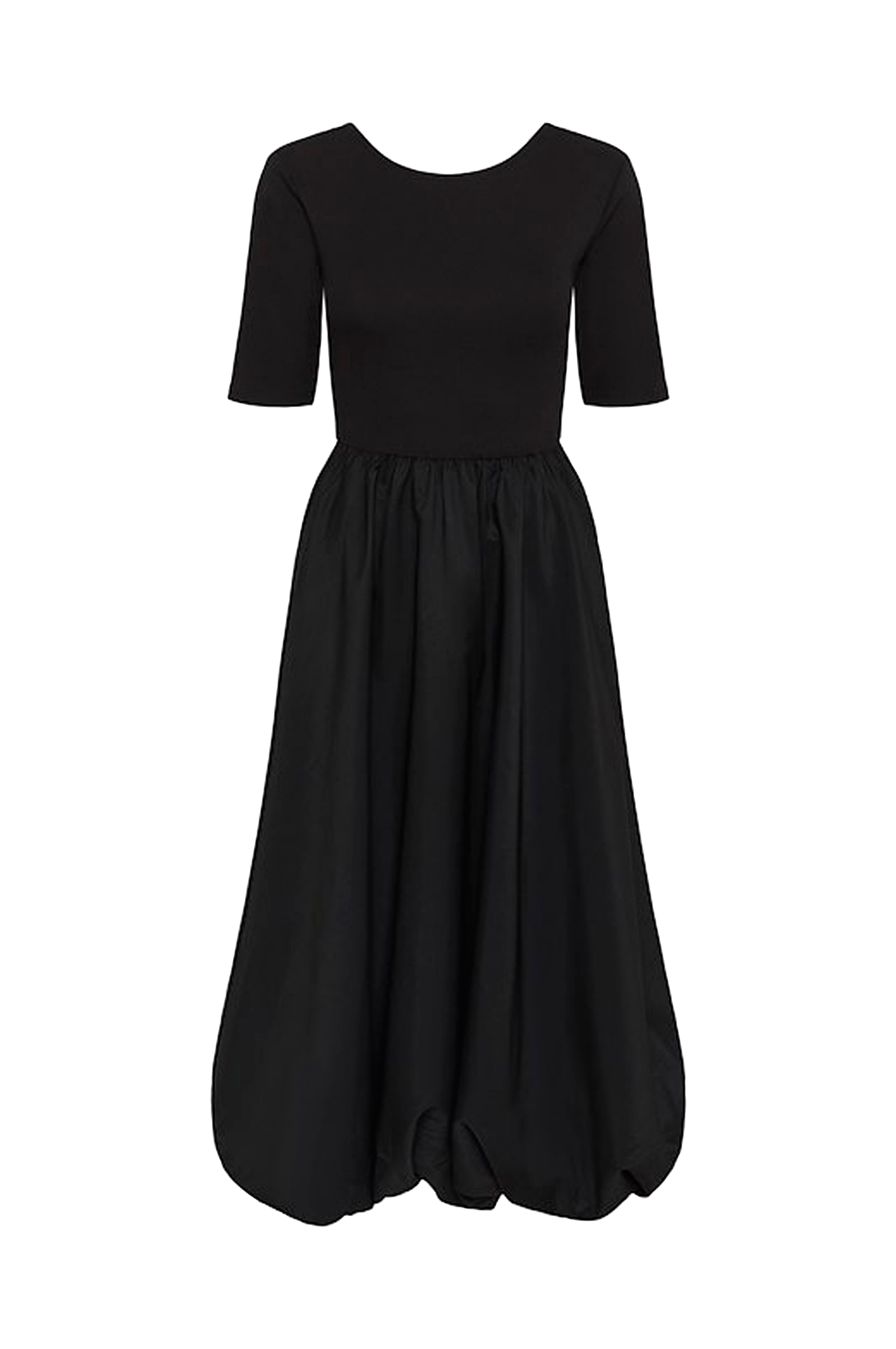 • Överdel i ribbad trikå• 3/4-långa ärmar• Djup u-ringning bak• Vävd, utsvängd kjol med ballongeffekt• Fickor i sidorna• Längd: 128 cm i storlek S