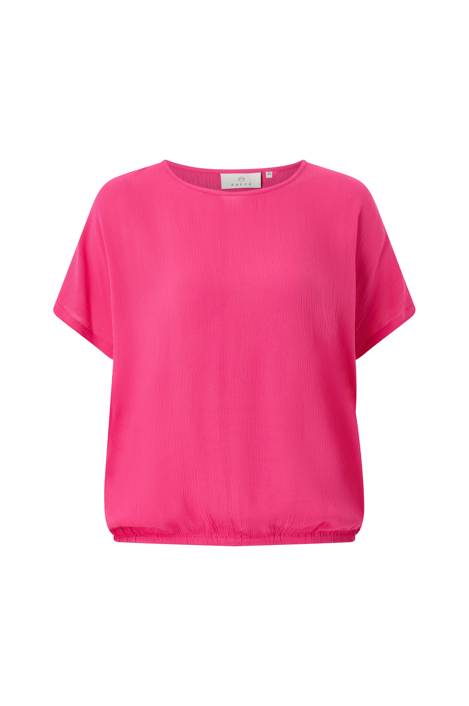 Rak modell med ledig form som har nerhasad axel och kort ärm. Rund hals med smal, påsydd kant samt infälld resår i nederkanten.
