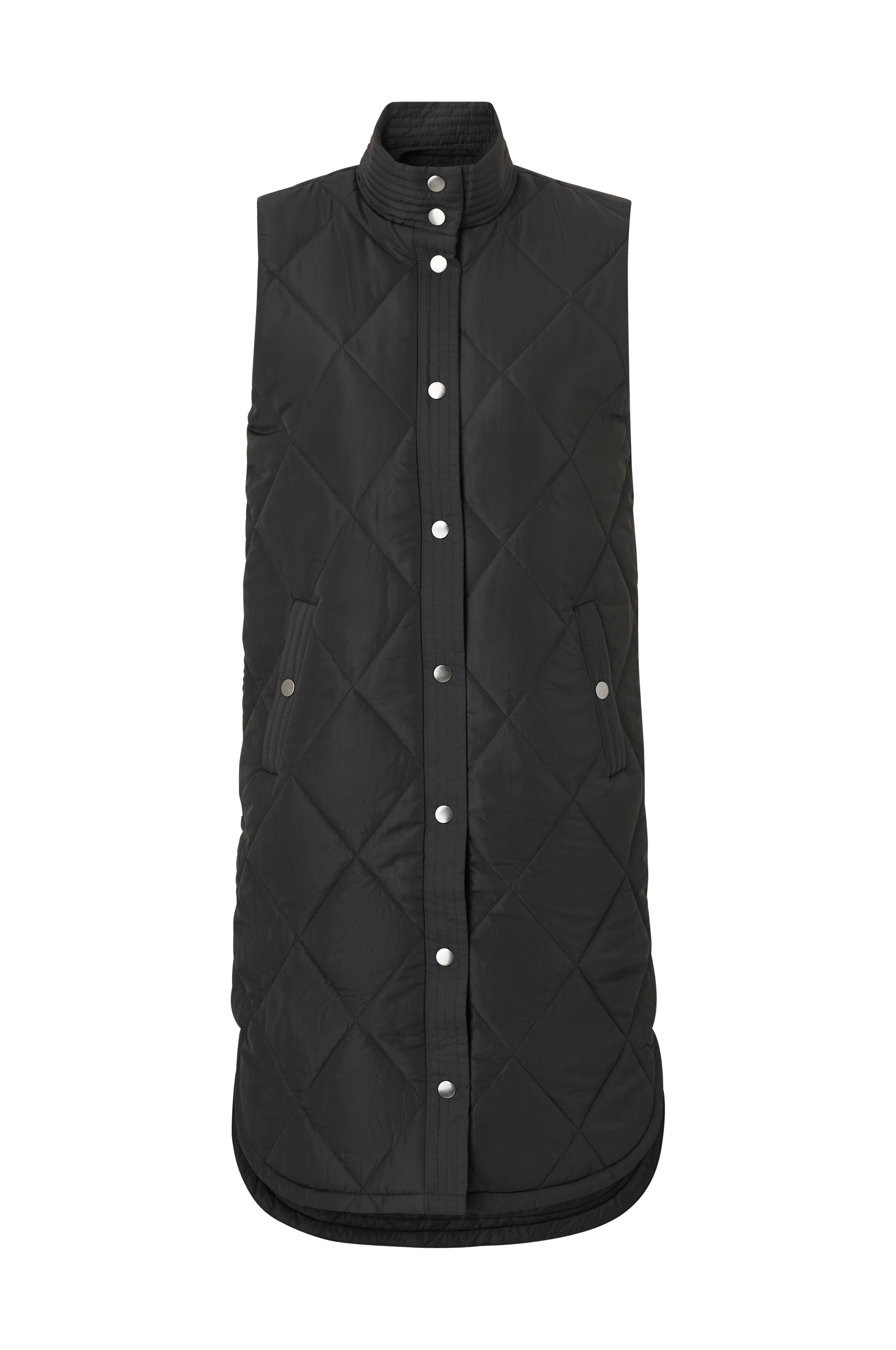 • Lätt vadderad, quiltad väst med ståkrage• Lång modell• Tryckknappar fram• Sidfickor med tryckknapp• Rundad nederkant med sprund i sidorna• Längd: 109 cm i storlek 36