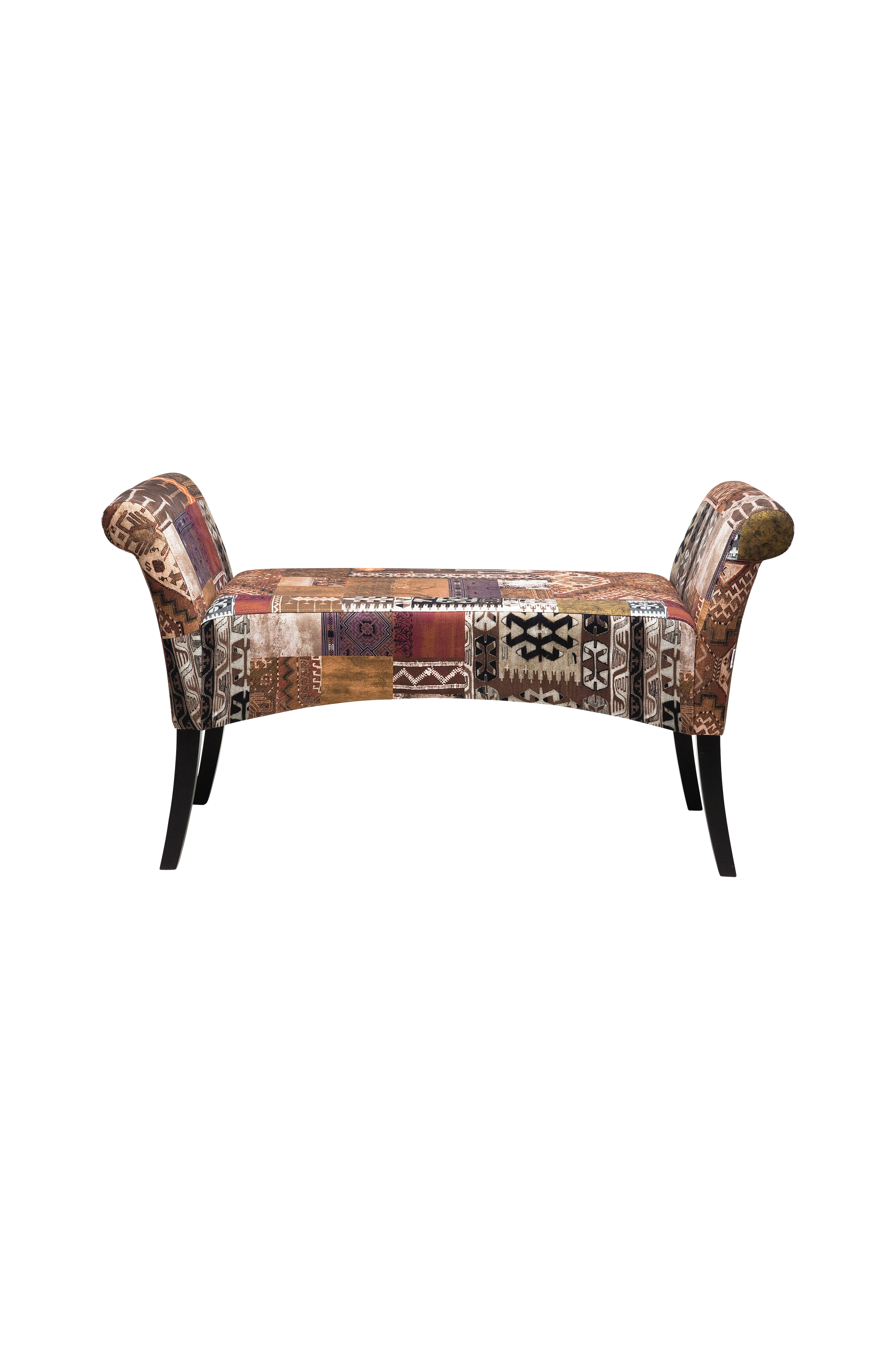 En exceptionell bänk i harmonierande färger - denna snygga bänk med stoppning ger ett starkt intryck, med böljande form och oemotståndlig klädsel med patchwork-design. Naturfärger bryts av med kontrastfärger som lila och blått, vilket ger en imponerande stämning. De elegant formade benen är tillverkade av målad bok. Varje bänk är unik, eftersom mönstren och färgerna alltid är något olika.