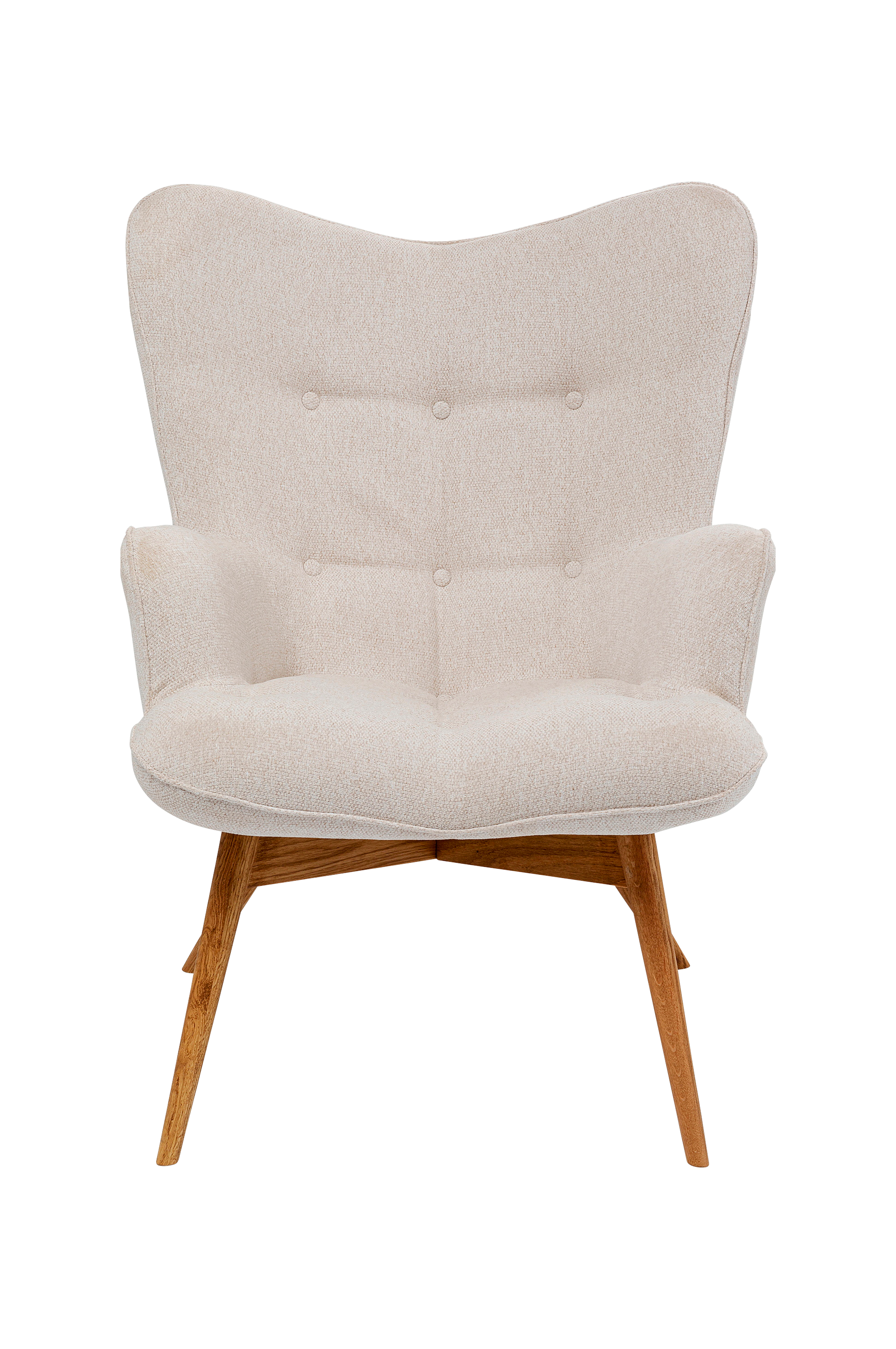 Denna loungestol i vacker cremefärg sticker verkligen ut! Tack vare den skickliga designen ser den mycket lättare och modernare ut än en traditionell öronlappsfåtölj. Njut av komforten i den rymliga sitsen och den behagligt rundade ryggen på denna fåtölj. Hörnstenen i en högkvalitativ och hållbar stoppad möbel är de material som används. Benen är tillverkade av massiv ek. Vi har lagt särskild vikt vid klädseltygets kvalitet: det är certifierat enligt standard 100 av eco-tex och dess yta avvisar fläckar och smuts. En TV-fåtölj, läsfåtölj eller designfåtölj för ditt vardagsrum - vilken roll kan detta mästerverk spela inom dina fyra väggar?