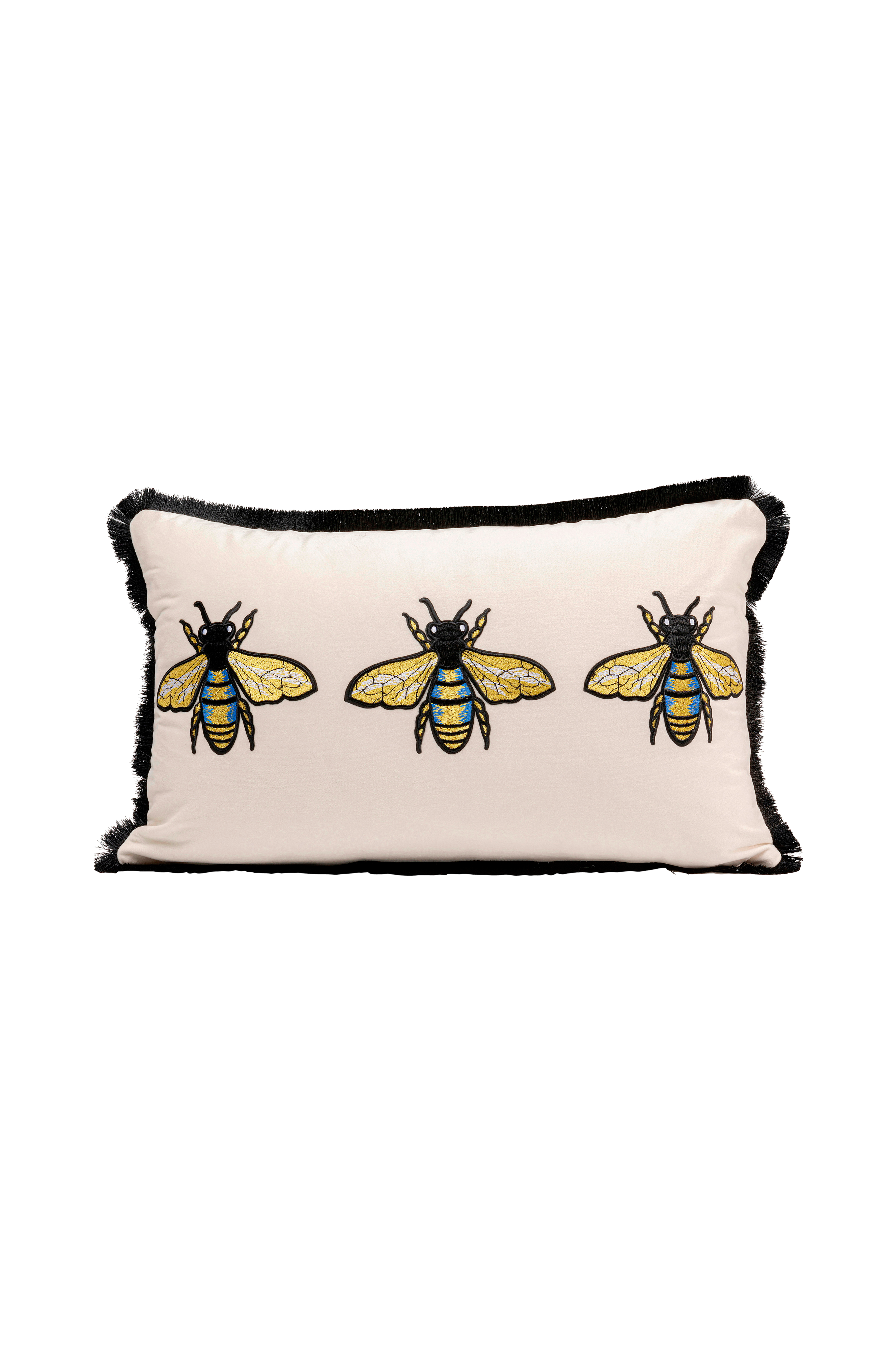 Denna prydnadskudde ger lyxig charm till alla hem med sitt elegant broderade bimotiv och guld- och svartfärgade detaljer. Det mjuka sammetsklädda överdraget inbjuder dig att luta dig tillbaka och förvandlar soffan, sängen eller fåtöljen till en oas av välbefinnande. De extravaganta fransarna avrundar den eleganta designen perfekt och skapar subtila accenter som harmonierar underbart med moderna eller klassiska interiörer. En snabb, glamorös uppgradering för alla rum!