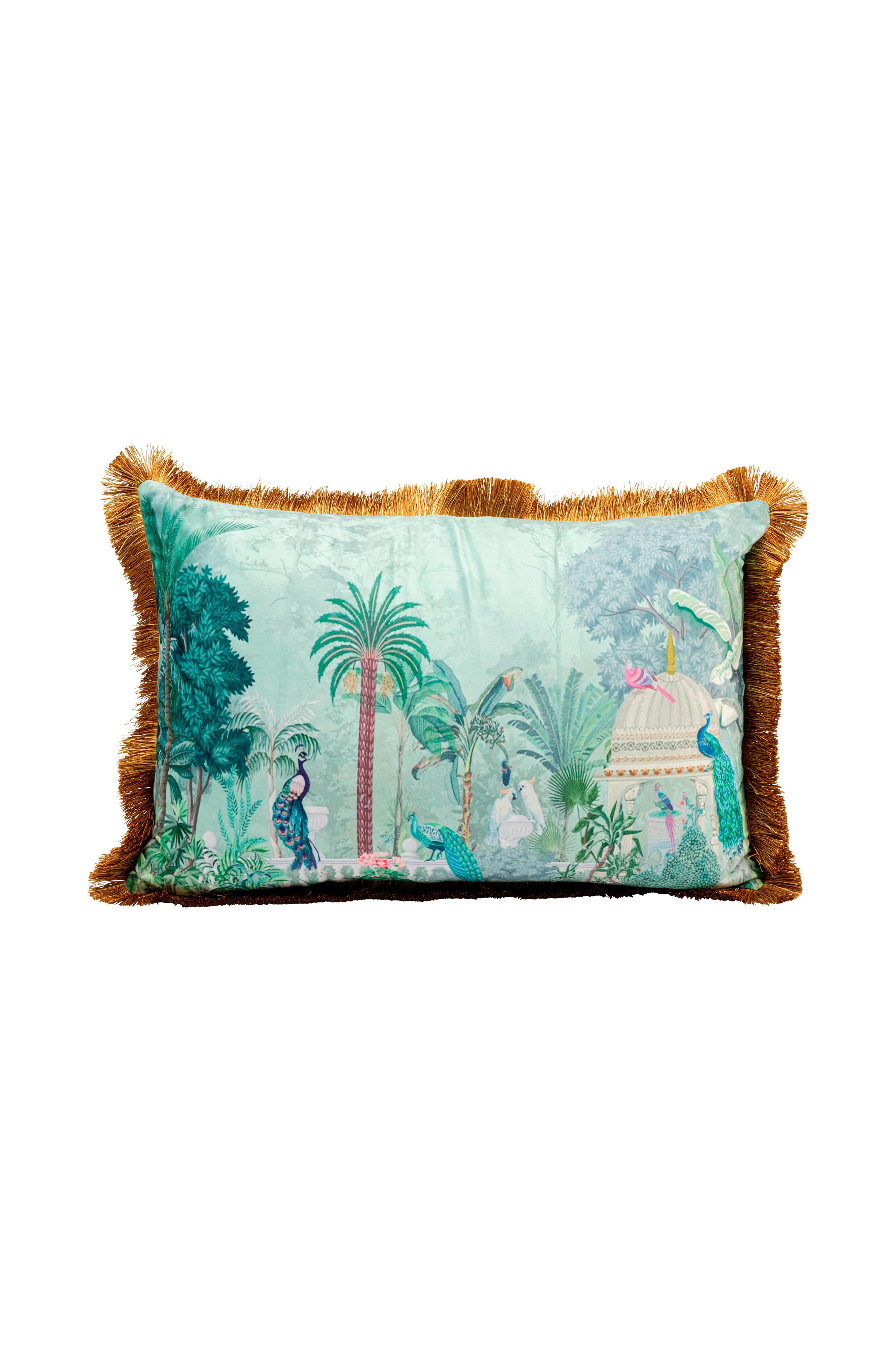 En touch av djungel möter mystisk tempelmagi: denna rektangulära dekorativa kudde presenterar ett detaljerat naturmotiv med exotisk känsla och konstnärlig karaktär. Kombinationen av livfulla gröna toner, pelare i antik stil och fantasifulla växter skapar en fascinerande bakgrund för eleganta bostadsdrömmar. Perfekt för att ge djup och personlighet till soffor, dagbäddar eller fåtöljer. Särskilt uttrycksfullt i kombination med sammetstyger, guldaccenter eller mörkt trä. Som solist eller i en ensemble med andra kuddmotiv gör denna textilaccessoar ett kraftfullt statement mellan urban djungel och dekorativ elegans. Ett riktigt blickfång med storytelling-potential.