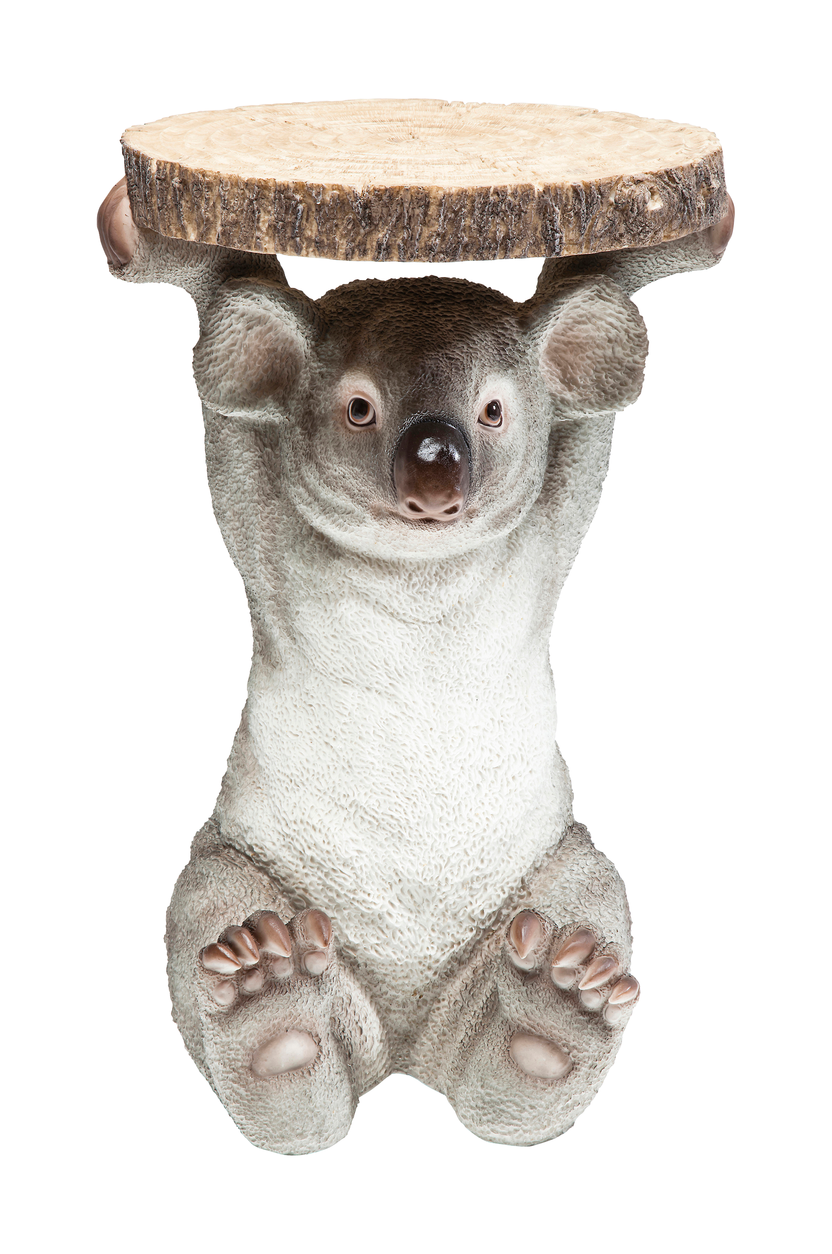 Sidobord med gosig trädinvånare. Australiens koala är nära förknippad med skogar - den hör trots allt hemma i denna vackra miljö av trä och varma färger. Därför är sidobordet Koala designat i enlighet med dessa faktorer och den lille krabaten får en skiva av trä att hålla. Koalan presenterar stolt sitt favorit bord, för din kaffekopp eller prydnadssaker.