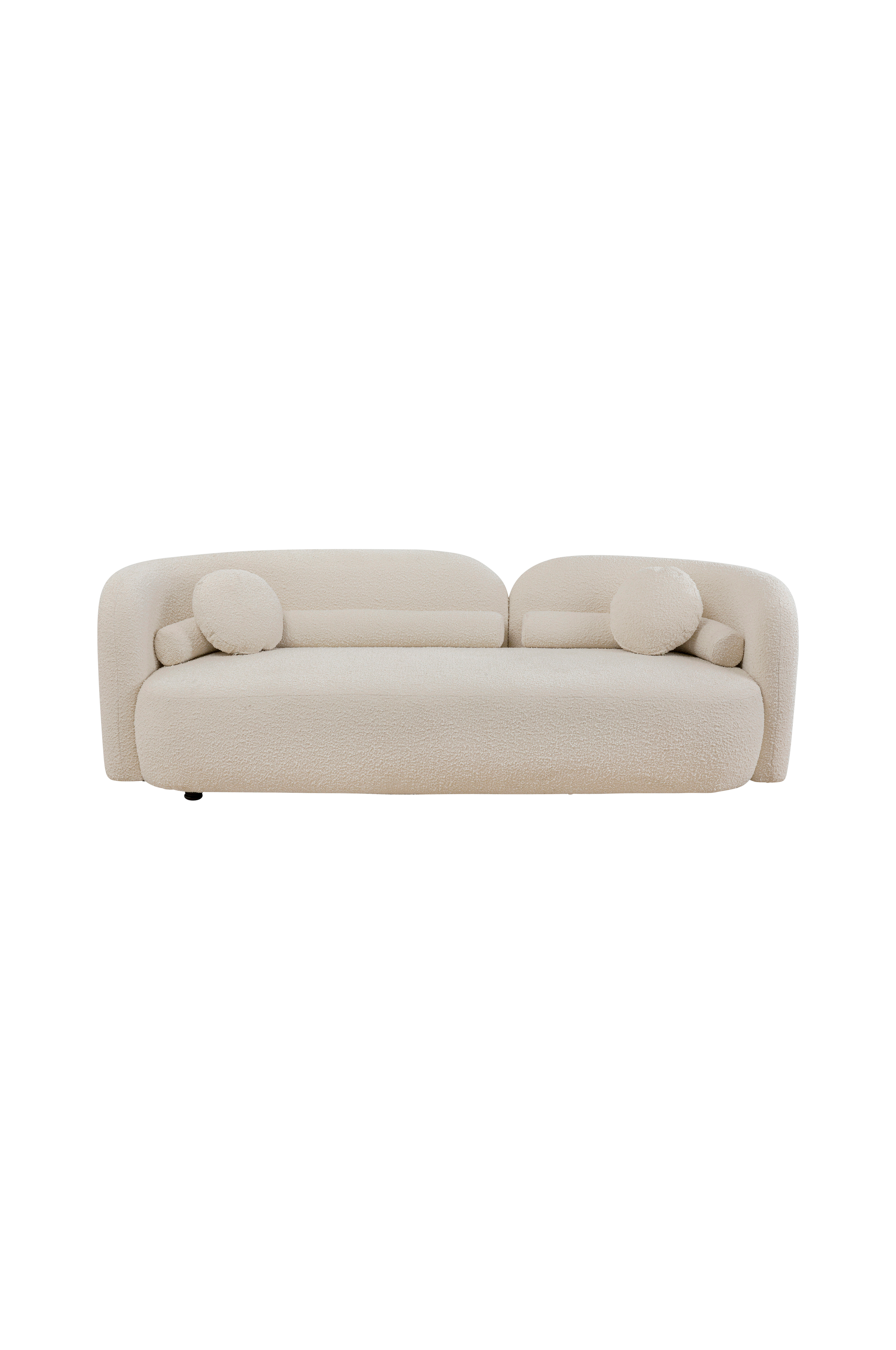 Den vita 3-sitssoffan kelly är en tidlöst elegant möbel som gör sig bra i alla moderna vardagsrum. Boucléklädseln ger soffan en lyxig och modern touch. De rundade ryggstöden och den stoppade sitsen inbjuder dig att luta dig tillbaka och koppla av. De medföljande runda och cylindriska kuddarna gör sittandet ännu bekvämare och är ett visuellt blickfång. Den moderna designen på denna tresitsiga soffa utstrålar lugn och en känsla av välbefinnande. Den inbjuder inte bara till avkoppling, utan ser också bra ut. Oavsett om det är i en ren, minimalistisk inredningsstil eller i kontrast med färgglada dekorationer - denna soffa är absolut mångsidig!