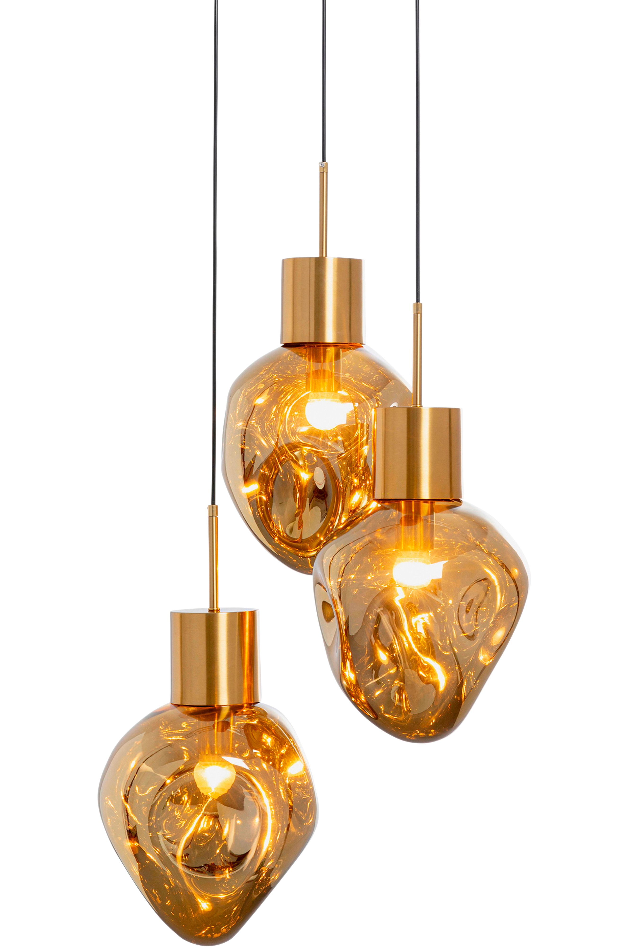 Med den här pendellampan får du inte bara ljus i mörkret, utan också design i ditt hem. De organiskt formade glaskulorna skimrar i en gyllene färg och deras oregelbundna former har en skulptural effekt. Eftersom pendellampan endast är 45 cm djup gör den också en fin figur ovanför mindre eller runda matbord.
