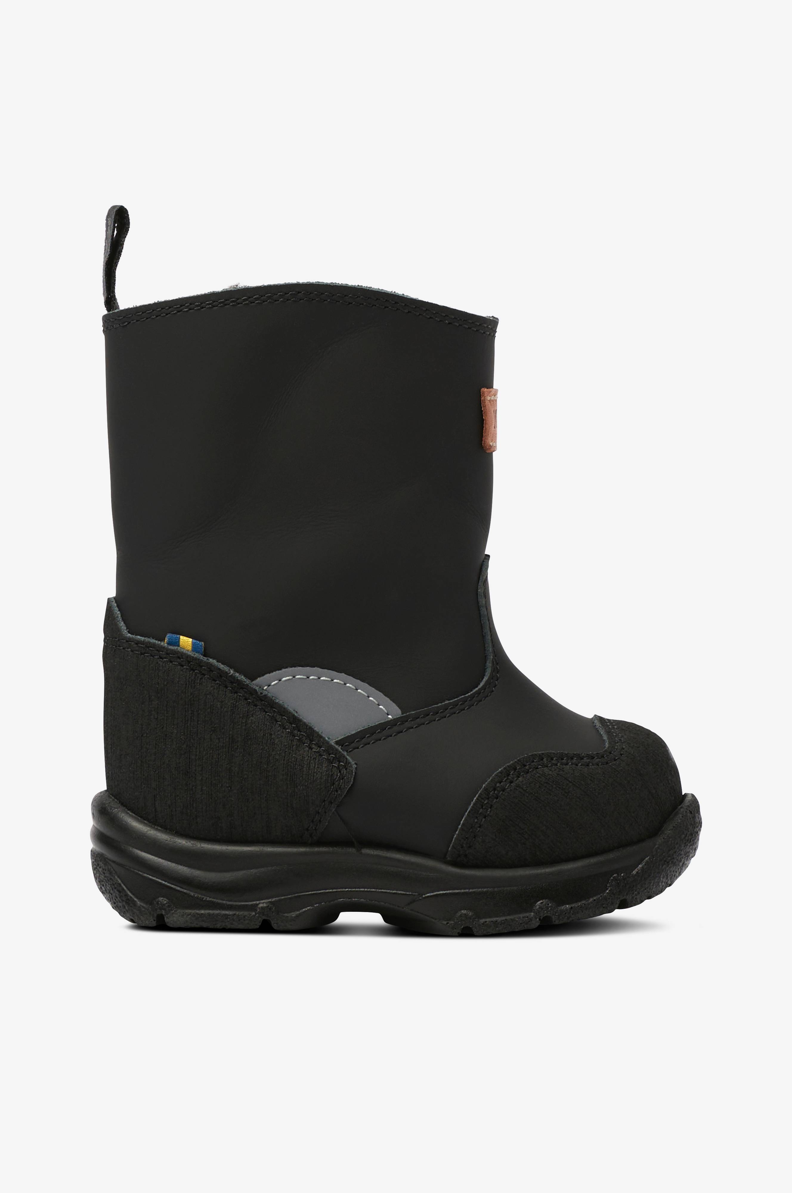 Höga vinterboots i slitstarkt och smutsavvisande skinn. Förstärkningar vid tå och häl. Värnande foder i ullmix håller fötterna varma under kalla dagar. Vid öppning upptill gör de enkla att ta på och av. Greppsäker yttersula.