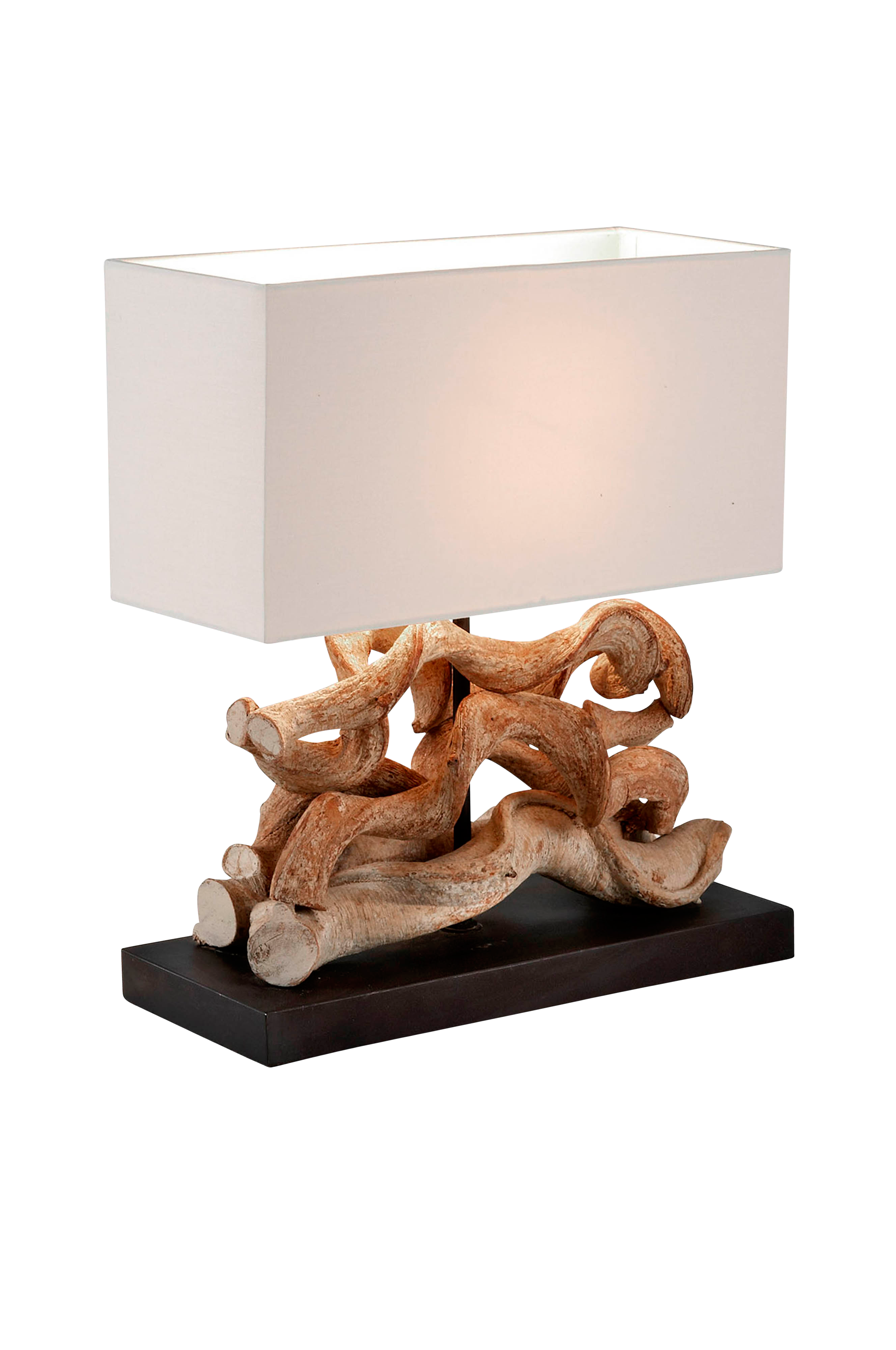 Bordslampa av återvunnet tropiskt trä och lampskärm av vit bomullstextil. Glödlampa E27 60W (medföljer ej).
