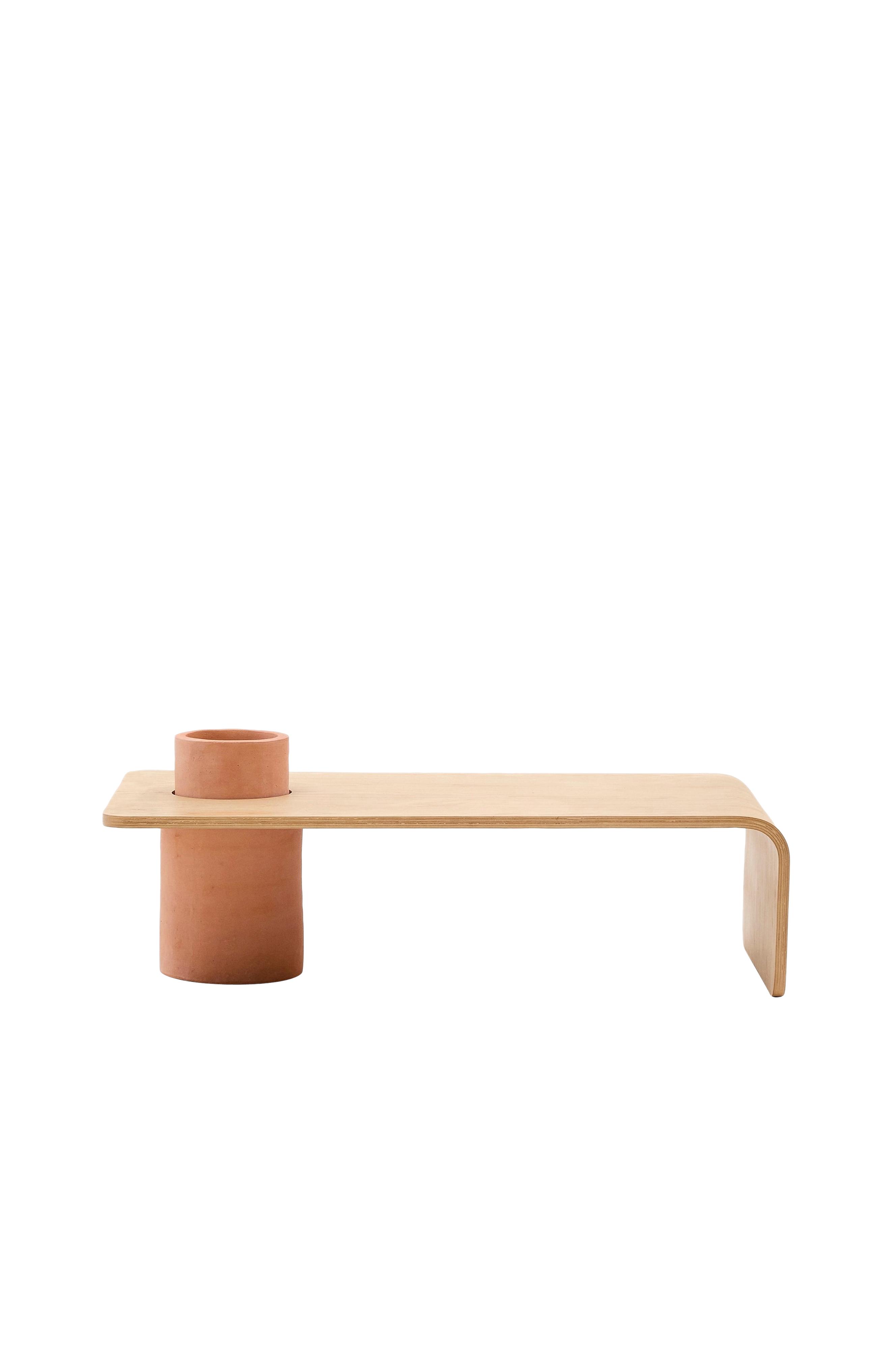 Olaria blandar ekfanér med terrakotta för att skapa ett soffbord med böjda kanter som passar perfekt för alla typer av utrymmen. Dessutom kan bordets fot användas som en växtkruka tack vare utrymmet inuti den. Design och mångsidighet förenas i en unik möbel. Produktens bredd: 1 cm. Produktens djup: 1 cm. Produktens höjd: 1cm.