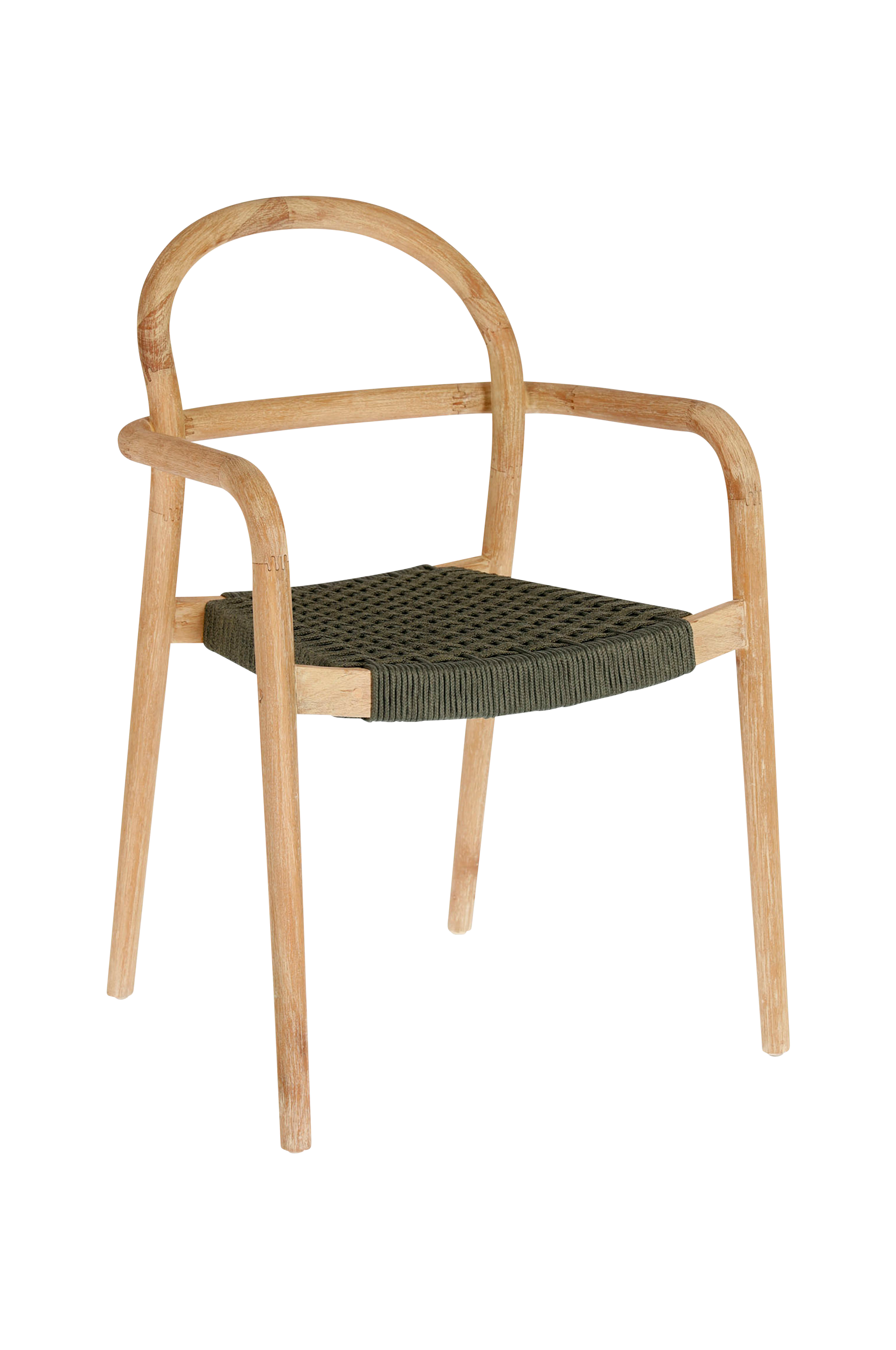 Handgjord av eukalyptusträ i naturfärg. Eftersom den är tillverkad av massivt trä är varje stol unik, med varierande nyans och fibermönster. För att skapa strukturen har flera manuella tekniker tillämpats, som till exempel att böja träet med hjälp av ånga. Stolen i grönt är också handvävd och kombinerar runda och platta rep, vilket ger en jämnare och mer stabil konstruktion. Bredd: 57 cm. Djup: 56 cm. Höjd: 83 cm.