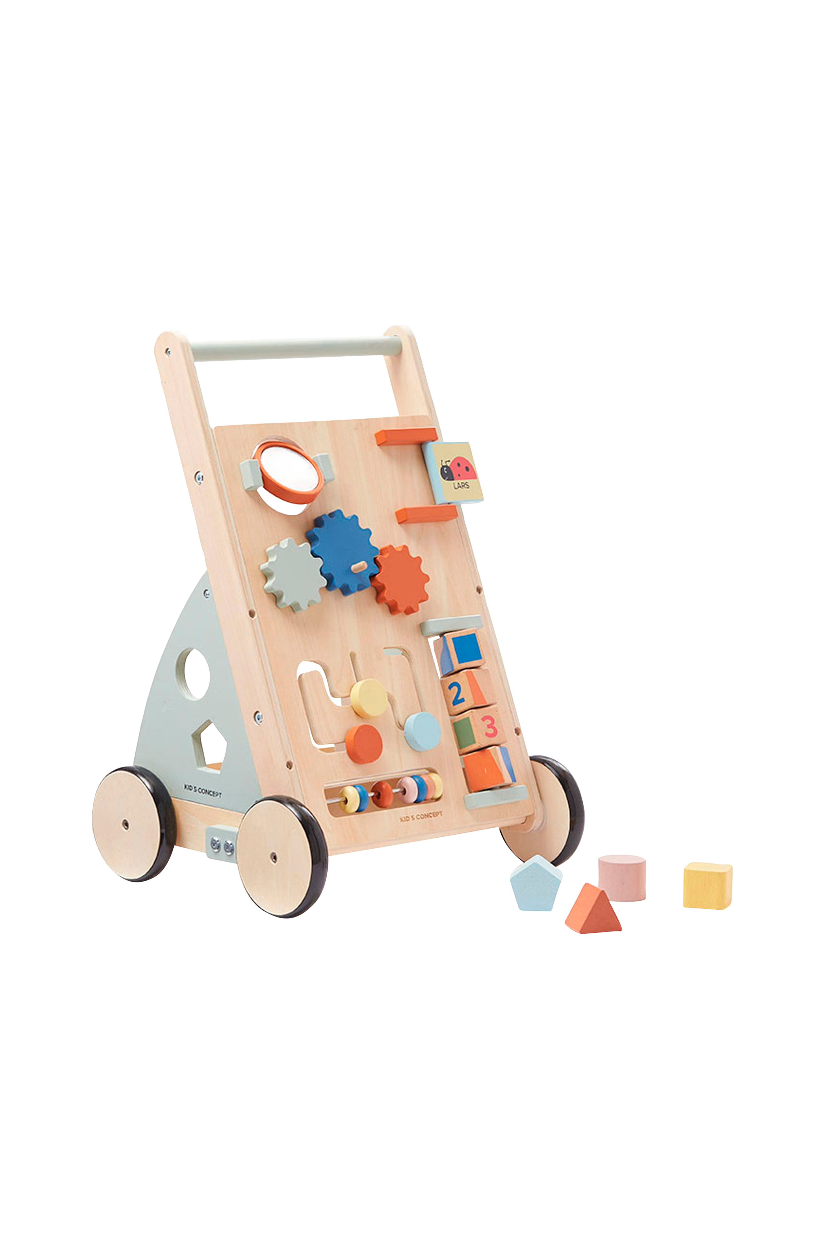 Denna mångsidiga lära gå-vagn är utformad för att växa med ditt barn och innehåller en aktivitetsbräda för olika utvecklingsfördelar. Brädan kan tas loss för lek på golvet för att förbättra överkroppsmuskler och balans. Den är utrustad med funktioner för hand-öga-koordination och problemlösningsförmåga. Brädan kan fästas på nytt för att öva på att gå, och vagnen har gummihjul som gör den smidig att köra på olika underlag. Den har bromsar för hastighetskontroll och levereras med klossar för ytterligare inlärningsaktiviteter.