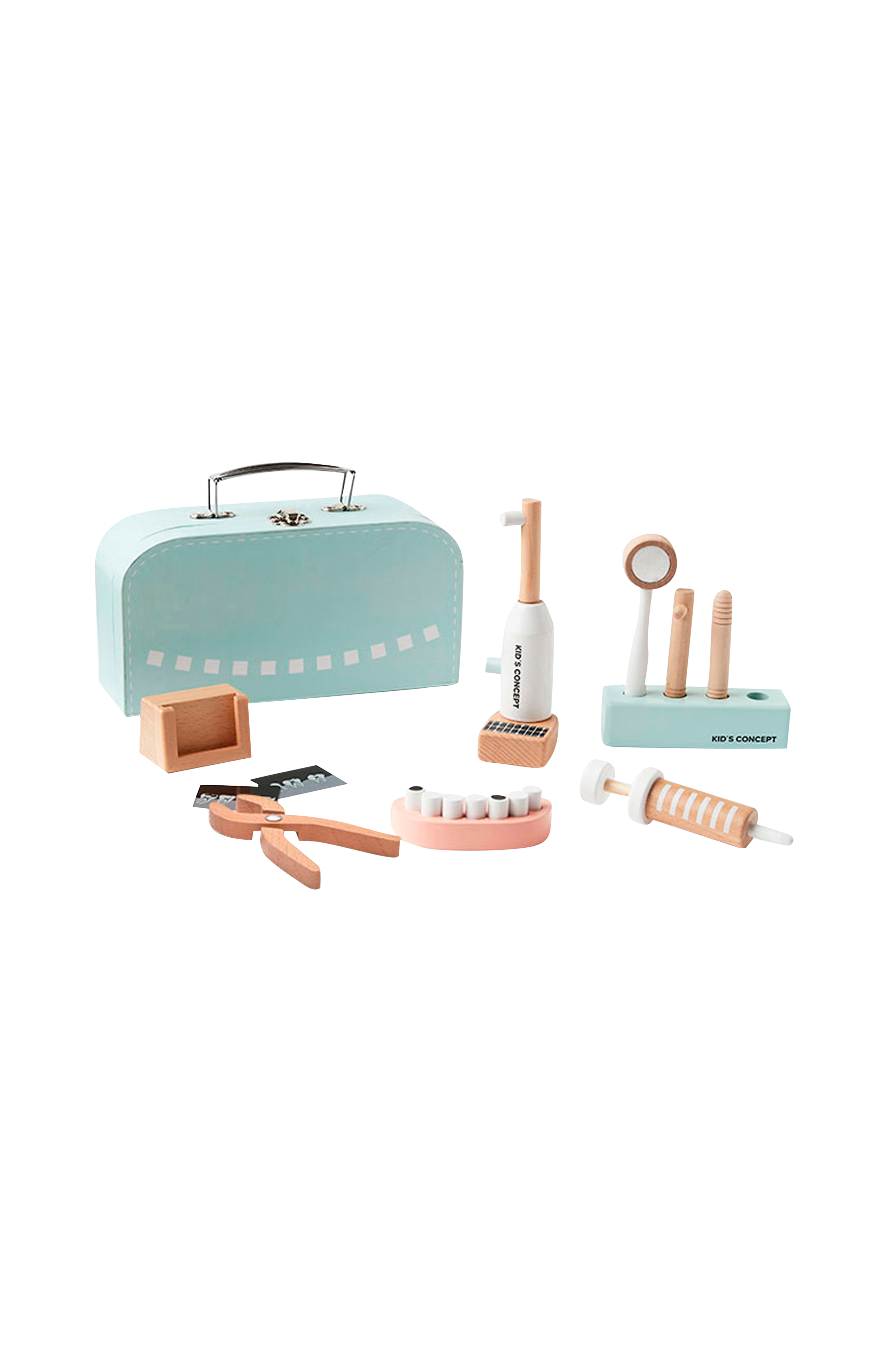 Tandläkarsetet levereras i en resväska av papp som är lätt att bära med sig. Tandläkarsetet stimulerar fantasin och vi garanterar många timmars engagerande rollspel och social träning. Samtidigt tränas motoriken och det går också att leka och bearbeta i efterhand hur tandläkarbesöket gick.