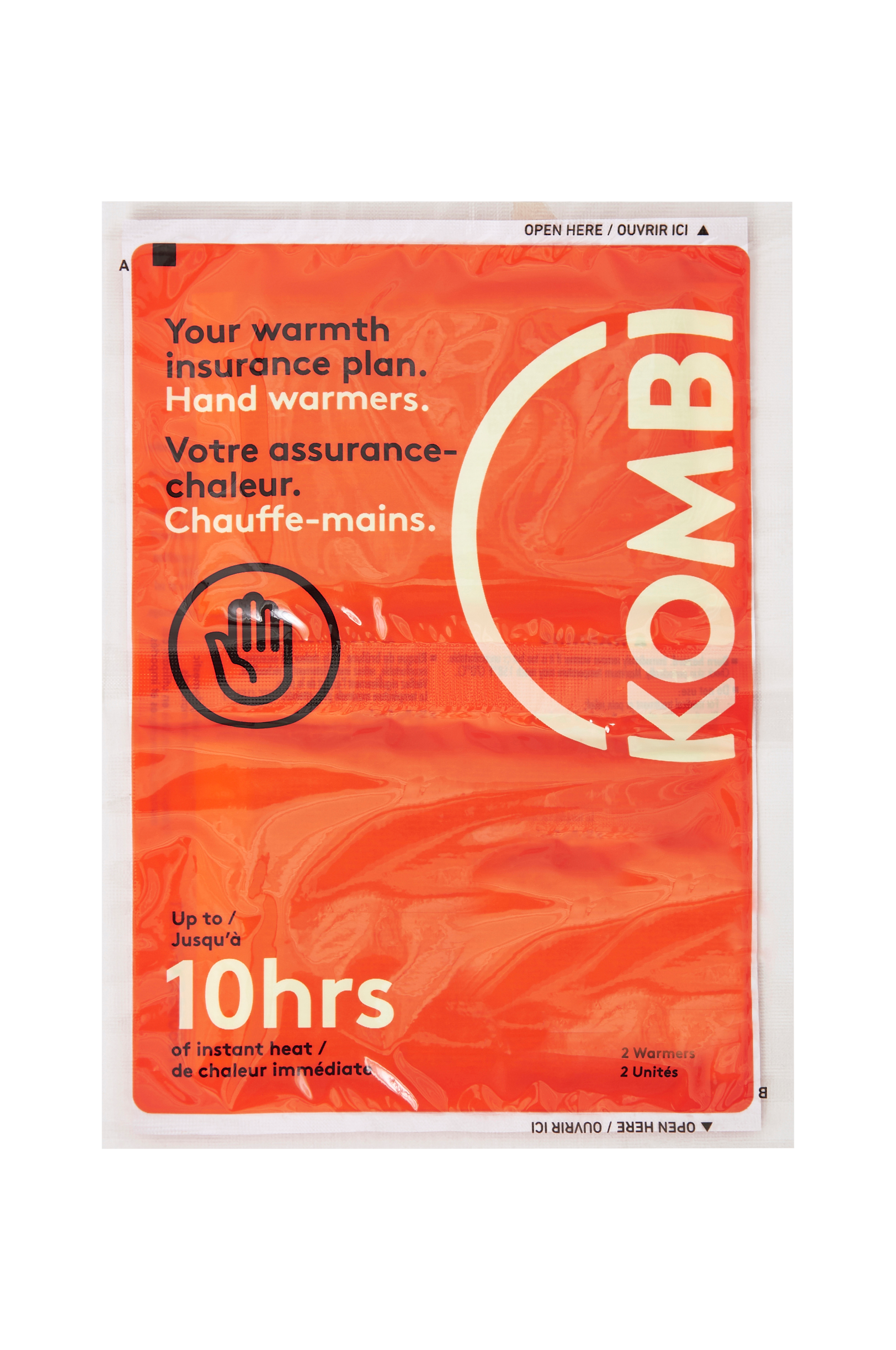 Engångs handvärmare från Kombi som du lägger i handskarna eller vantarna. Handvärmarna blir varma så snart du öppnar förpackningen och värmen håller i upp till 10 timmar.