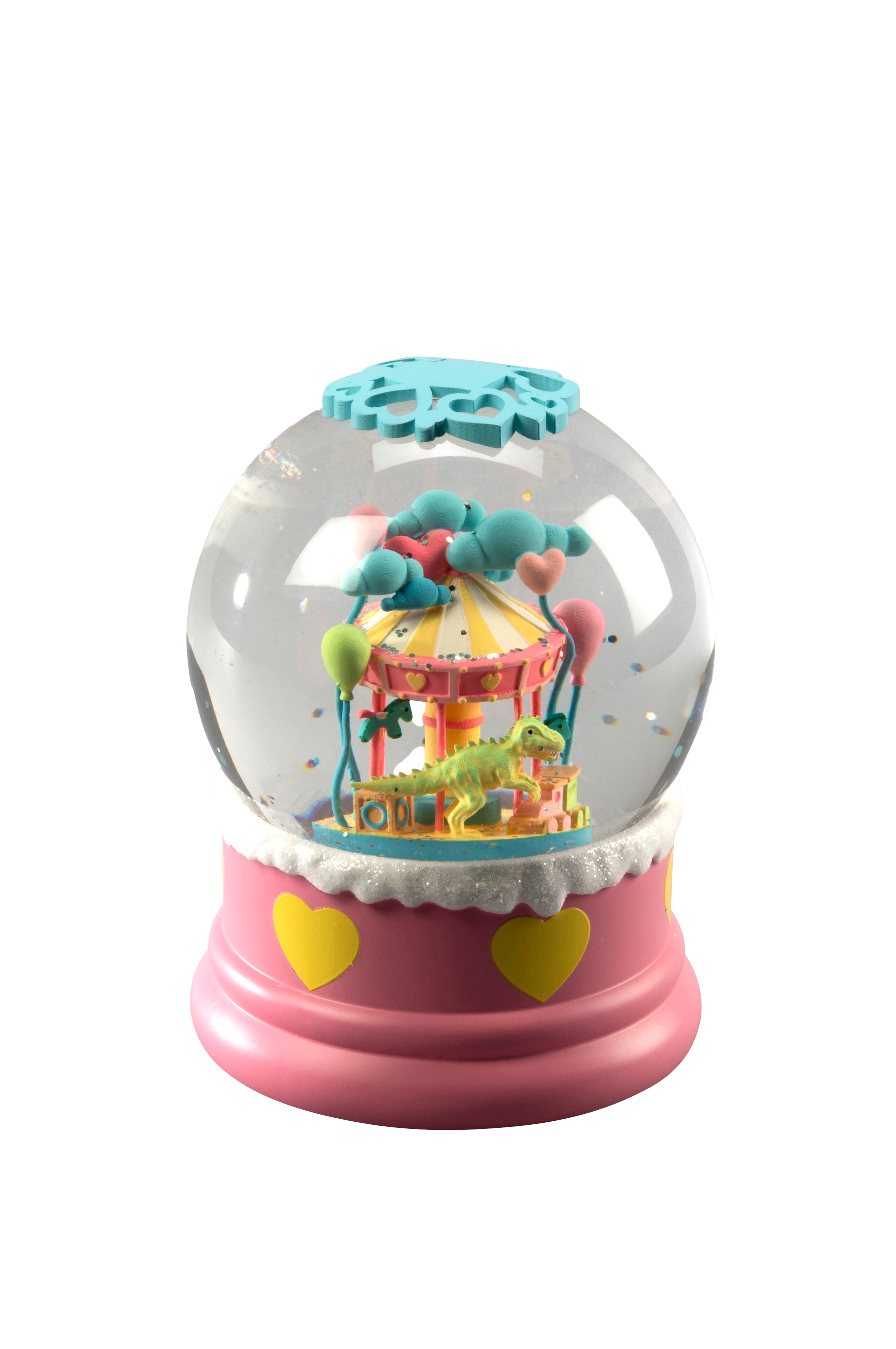 Finurlig snöglob med en karusell och en dinosaurie, omgiven av färgglada ballonger, moln och virvlande glitter. Varmvit led-belysning skapar ett mysigt sken och den inbyggda 5-timmars timern ger bekväm användning. Drivs med 3xaaa-batterier (ingår ej). Dimensioner: 16,5 cm hög, 12,5 cm bred. En lekfull och charmig dekoration som är perfekt för barnrum eller festliga julskyltningar.
