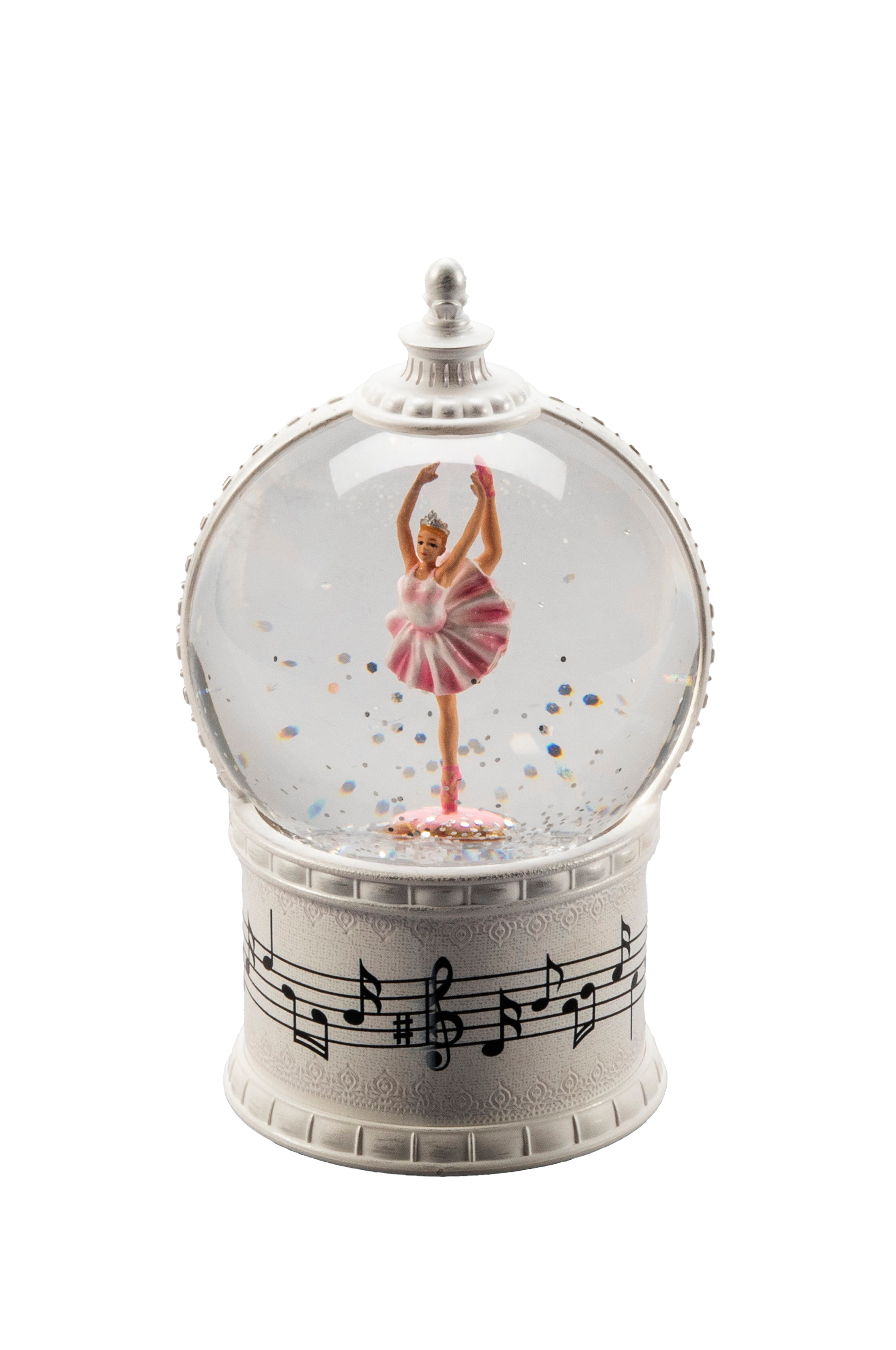 Graciös snöglob med en ballerina i rosa klänning som snurrar till musik. Virvlande glitter, varmvitt led-ljus och roterande rörelser ger liv åt den här magiska scenen. Har en timer på 5 timmar och drivs med 3xaaa-batterier (ingår ej). Höjd: 17 cm, bredd: 10,5 cm. En charmig upplyst musikglob som passar perfekt i barnrummet, som juldekoration eller som present.