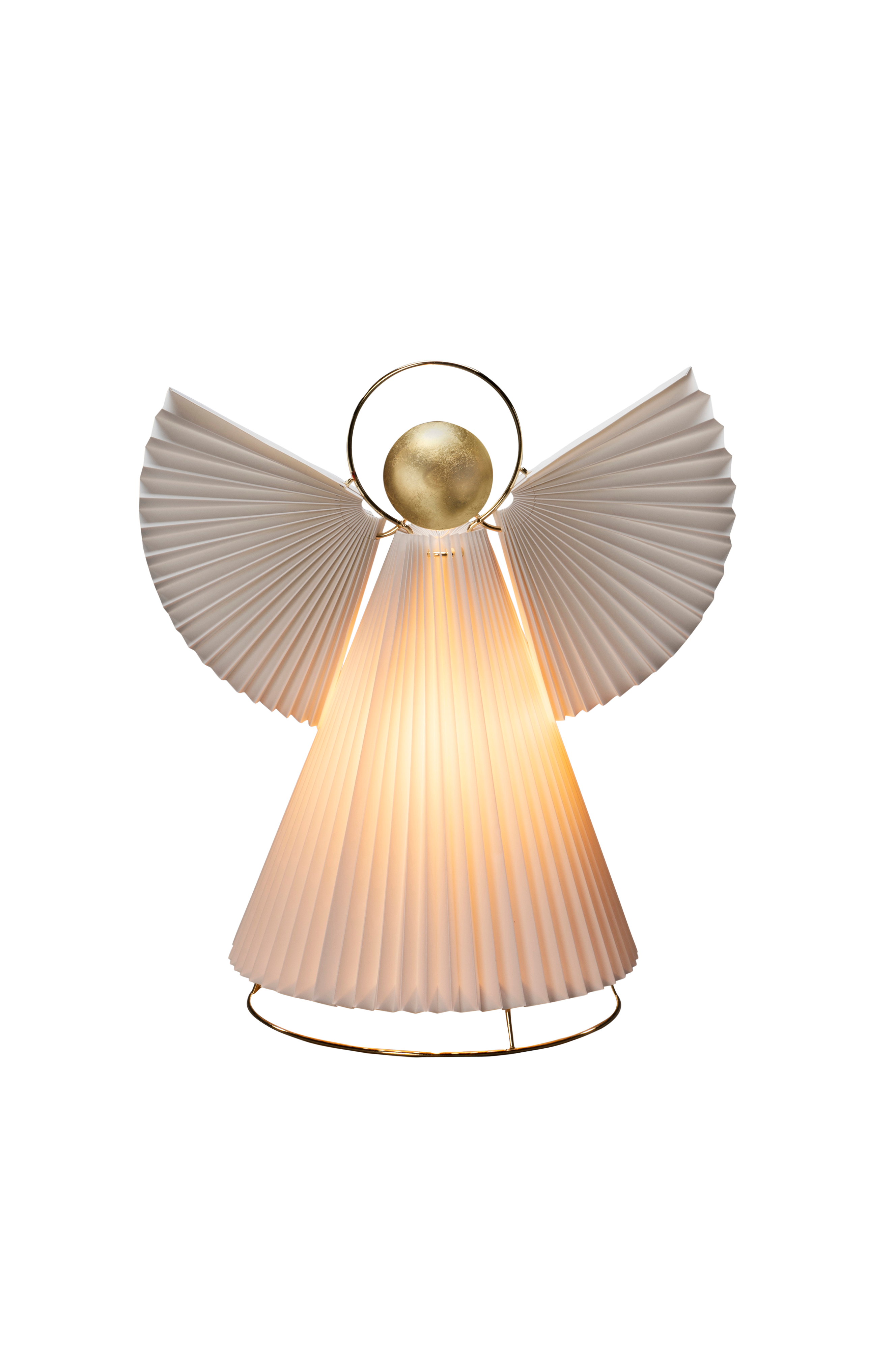 Ängel i plisserat papper med mässingsfärgade detaljer. E14 lamphållare (ljuskälla ingår ej). 36 cm hög och lång anslutningssladd på 5 meter.