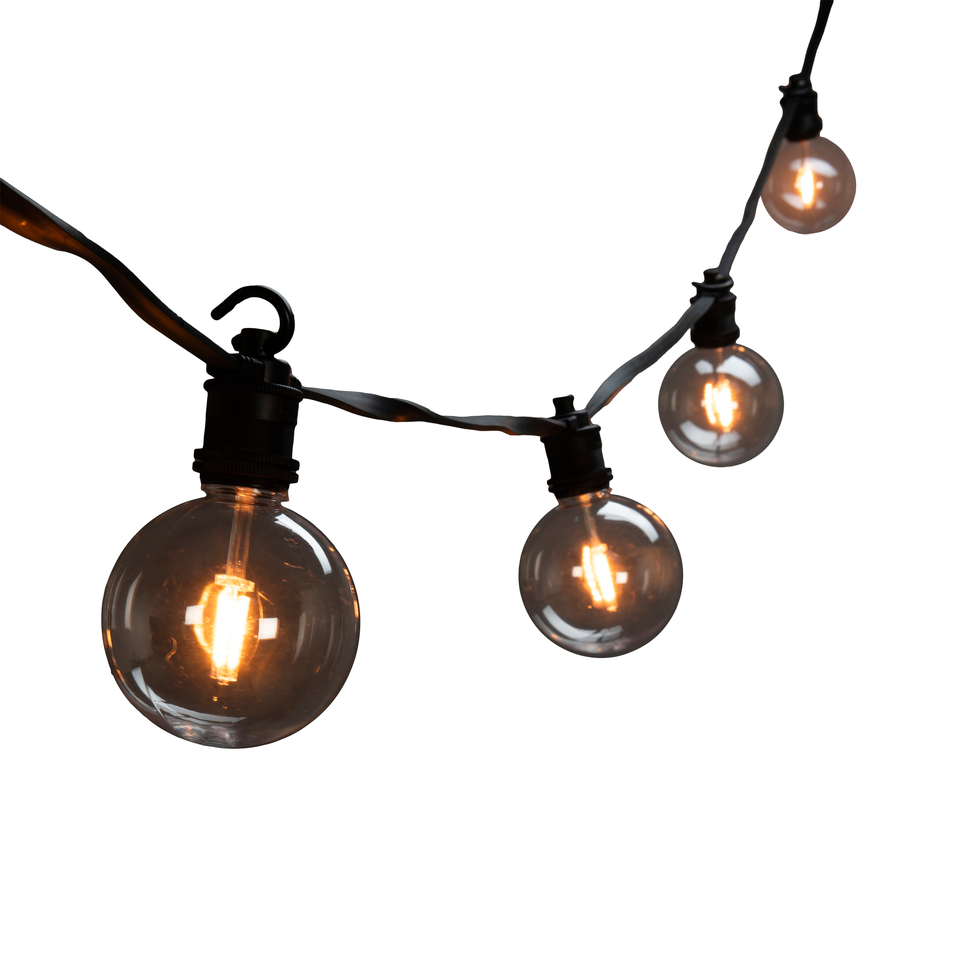 Snyggt partyljus med sfäriska kupor i grå rökfärg. Ljussetet har 10 st lysdioder som kan bytas ut vid behov, 24v transformator med inbyggd dimmer. Längd 450 cm och anslutningskabeln är 1000 cm. Godkänd för utomhusbruk.
