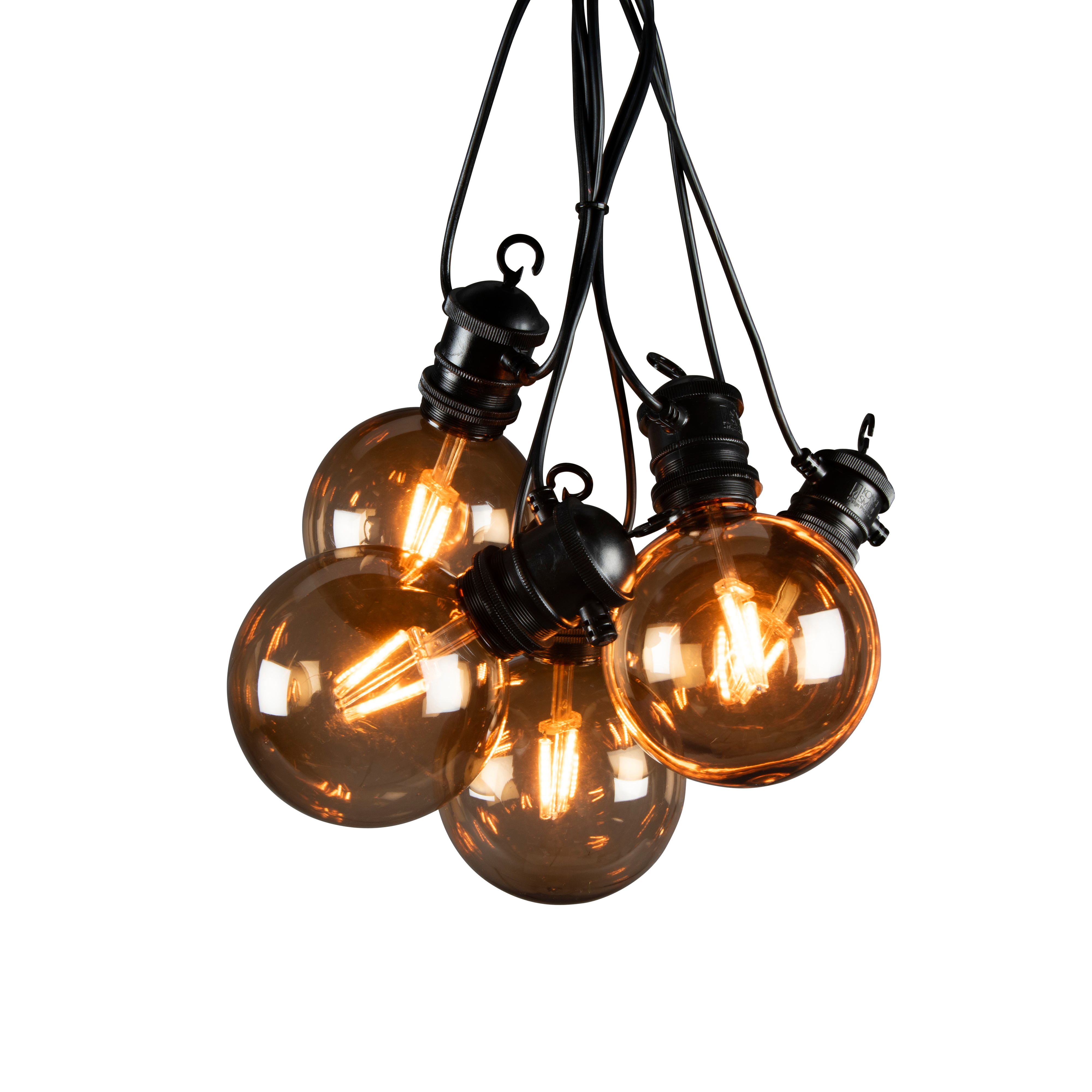 Snyggt partyljus med sfäriska kupor i grå rökfärg. Ljussetet har 10 st lysdioder som kan bytas ut vid behov, 24v transformator med inbyggd dimmer. Längd 450 cm och anslutningskabeln är 1000 cm. Godkänd för utomhusbruk.