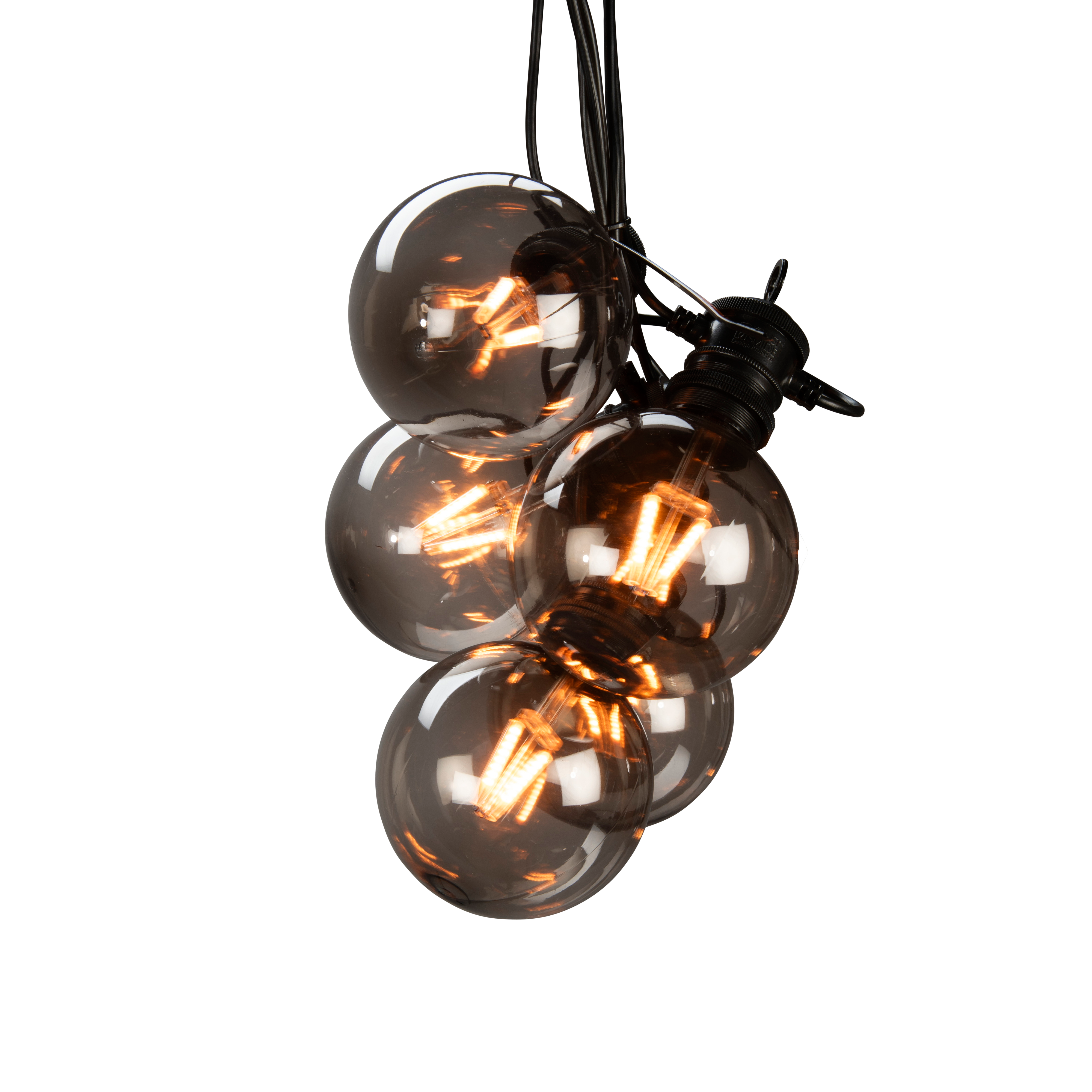 Snyggt partyljus med sfäriska kupor i grå rökfärg. Ljussetet har 10 st lysdioder som kan bytas ut vid behov, 24v transformator med inbyggd dimmer. Längd 450 cm och anslutningskabeln är 1000 cm. Godkänd för utomhusbruk.