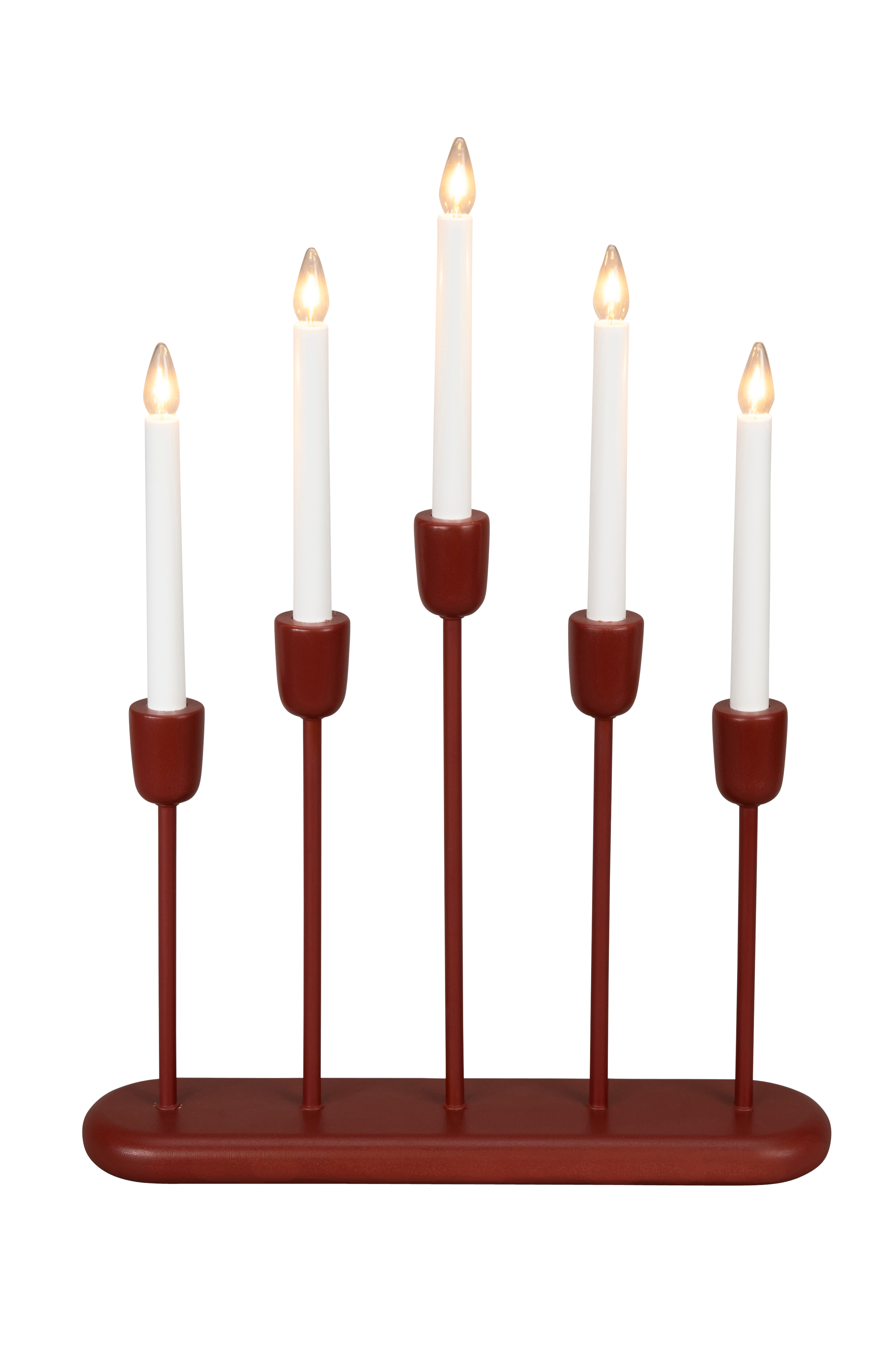 En 5-armad elektrisk ljusstake med varmvita lysdioder. Mörkröd. Anslutningskabel på 1,7 meter. Strömbrytare för manuell på/av. Höjd 53,5 cm och bredd 38 cm.