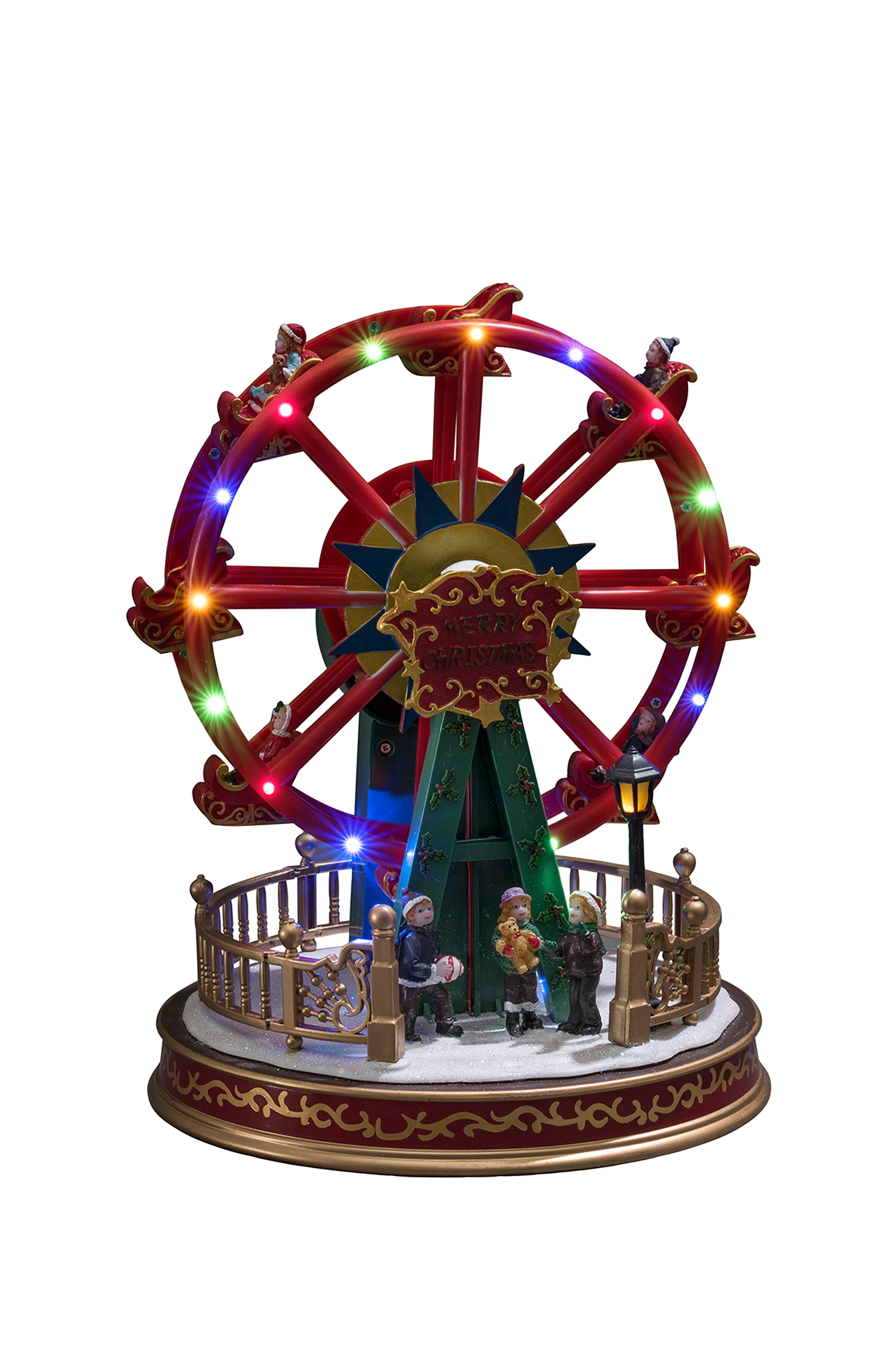 Skapa en festlig stämning med ett snurrande pariserhjul i vinterskrud. Hjulet har 19 flerfärgade lysdioder. Höjd 29 cm, bredd 21 cm. Drivs med en 4,5 V transformator eller 3 aa-batterier (ingår ej). Endast för inomhusbruk.
