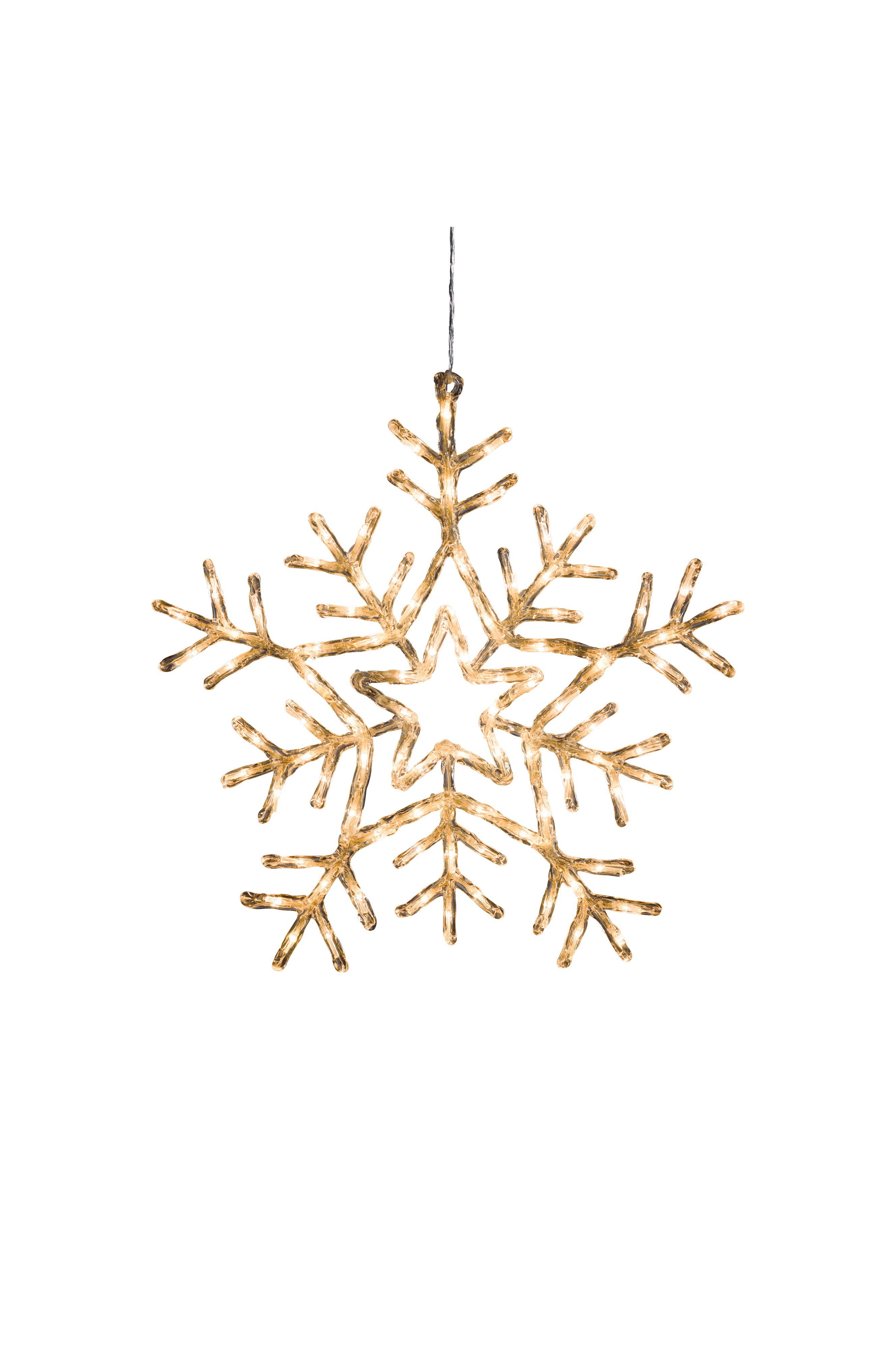 Snöflinga i akryl med 90 varmvita LED och multifunktion för utomhusbruk. Drivs av en 24V transformator. Transparent anslutningskabel på 5 meter. Diameter 58 cm.