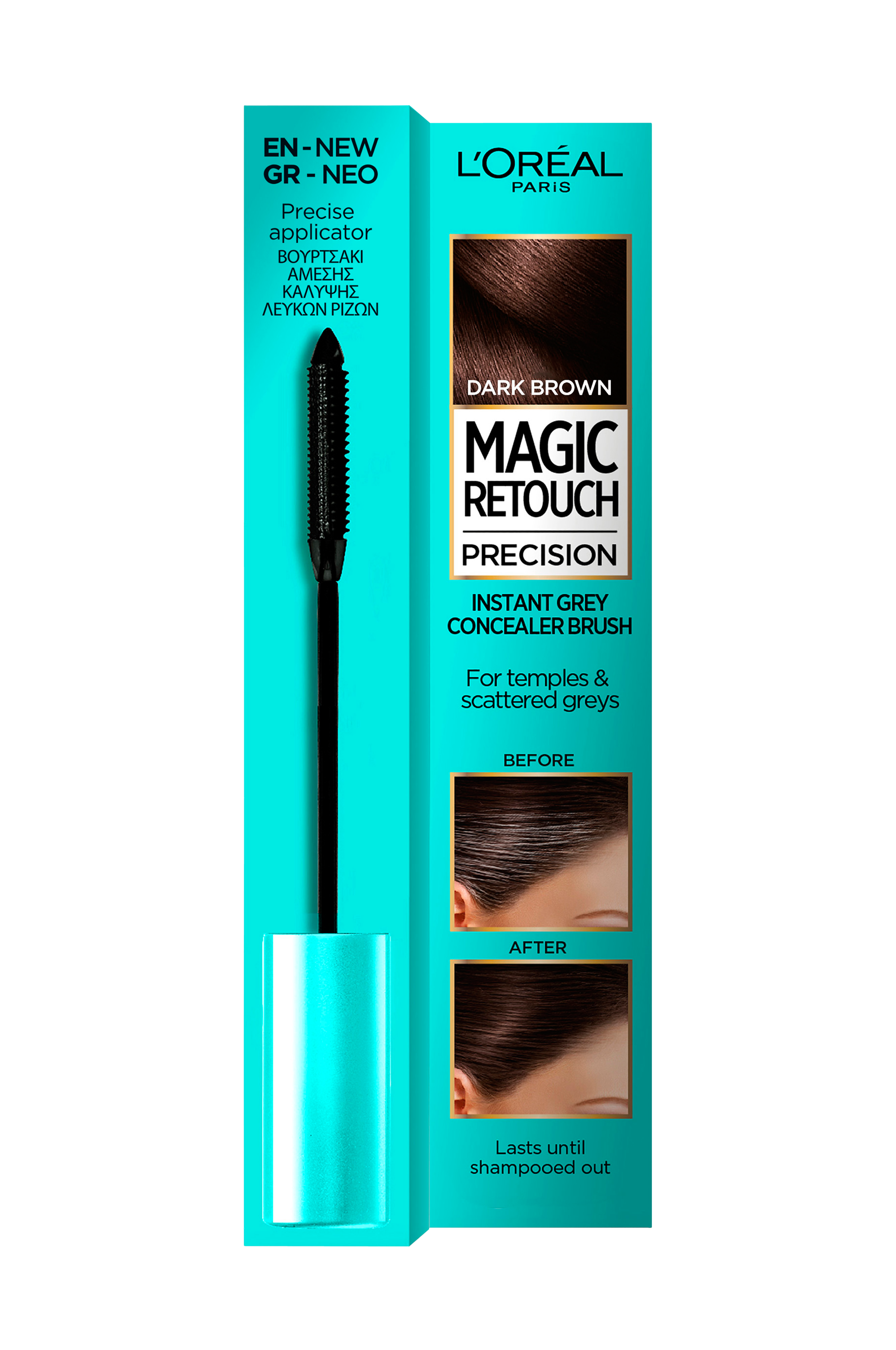 Färgborste för tillfällig täckning av gråa hår. Lätt och precis applicering.