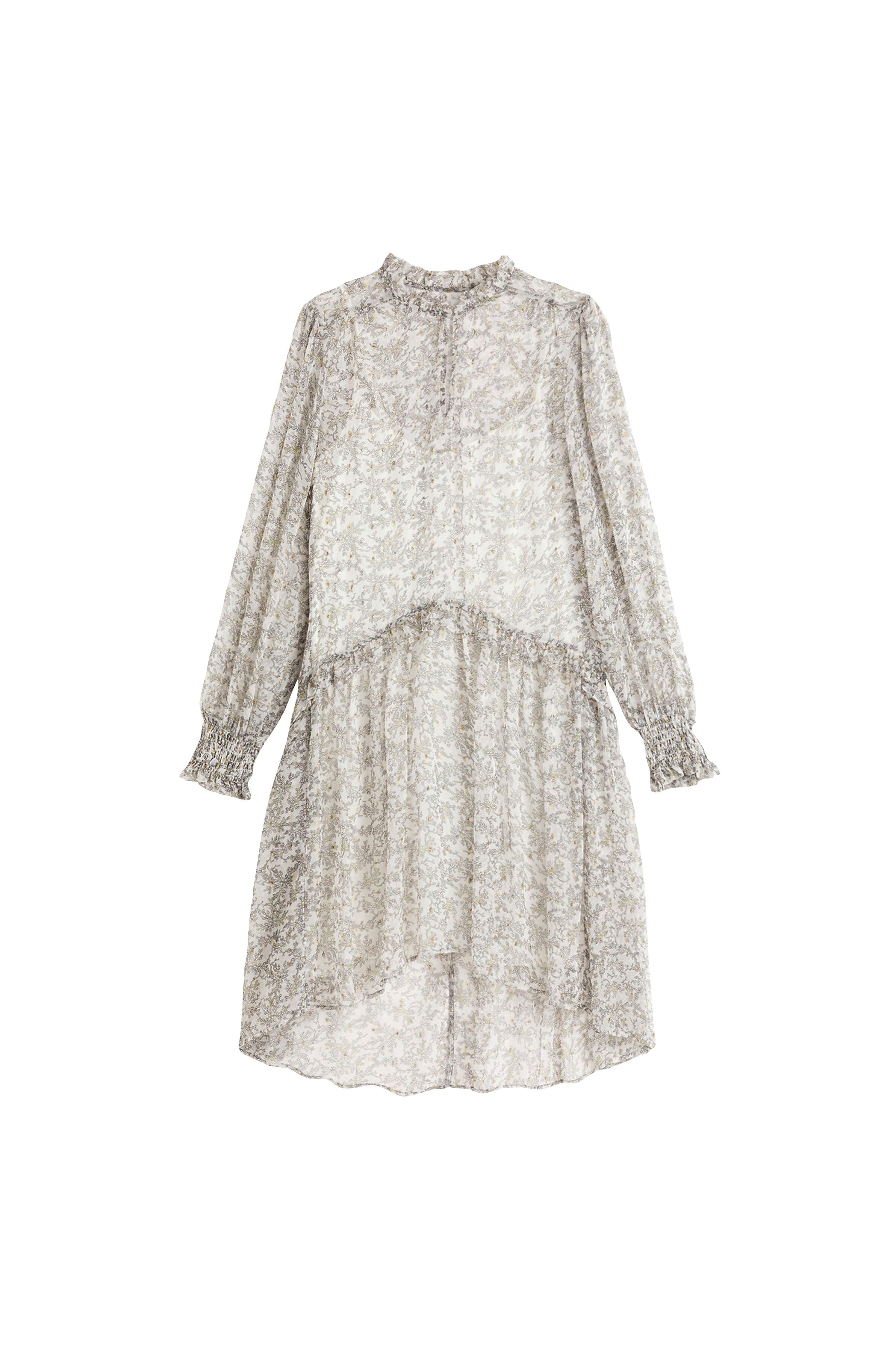 Klänning i lätt skimrande muslin med transparent effekt. Romantisk modell i lätt material, med inspiration från 1920-talet. Luftig och smickrande passform. Detaljer - Utställd modell - Kort modell - Lång ärm med smock i ärmslut - Ståkrage - Blommönster - Längd 90 cm i storlek 38 Material och skötselråd - Huvudsakligt material: 97% polyester, 3% metallfiber - Foder: 100% viskos - Fintvätt 30° - Stryks på låg temperatur / tål ej blekmedel - Tål ej torktumling - Tål ej kemtvätt