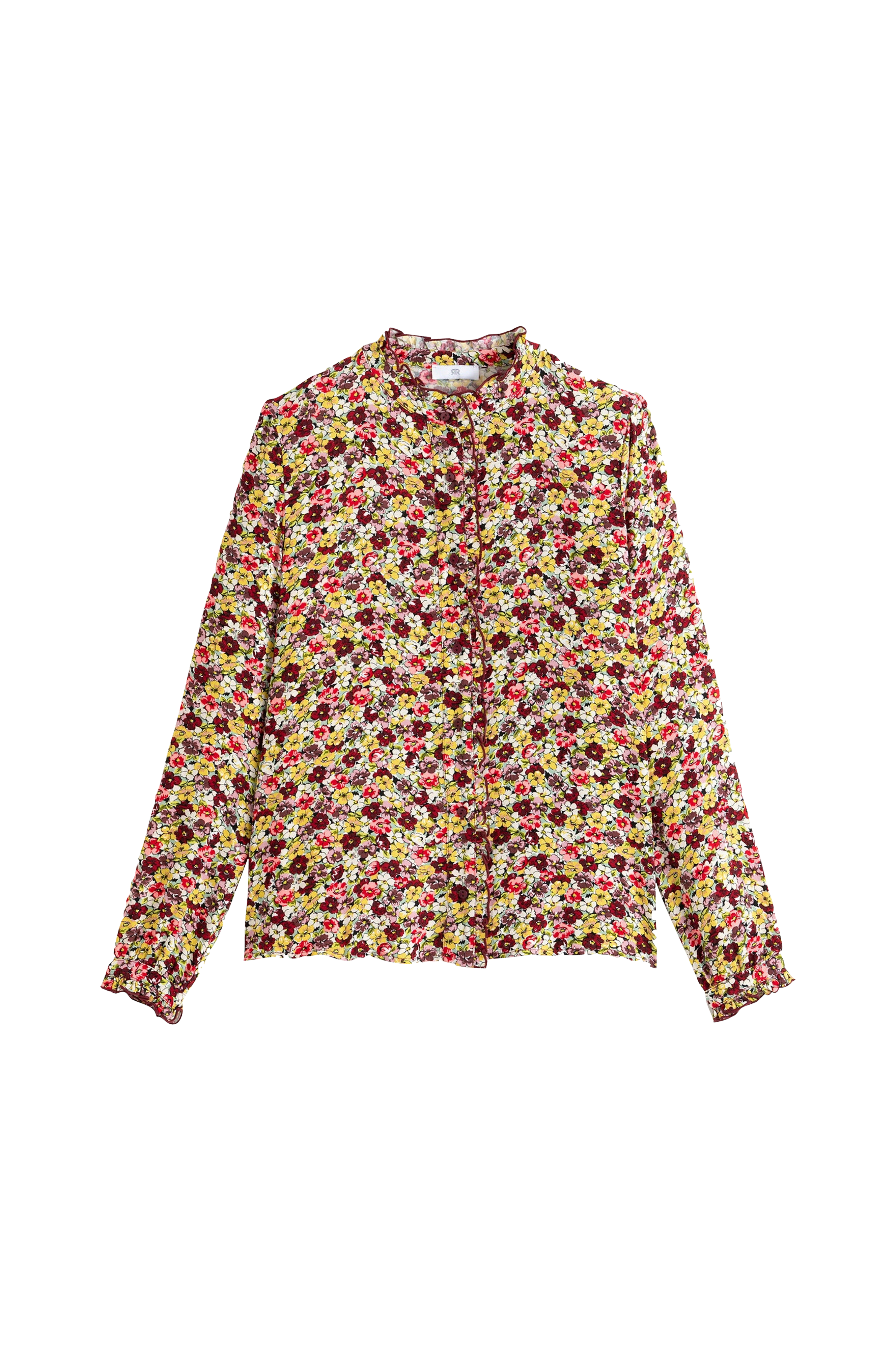 Liten ståkrage, volangkanter och vackert mönster. Blus i romantisk stil. Detaljer - Lång ärm - Rak modell - Ståkrage - Volangkant på kragen, längs knappslån och i ärmslut - Blommönster - Längd 64 cm i storlek 38 Material och skötselråd - 100% viskos - Fintvätt 30° - Stryks på låg temperatur / tål ej blekmedel - Tål ej torktumling - Tål ej kemtvätt