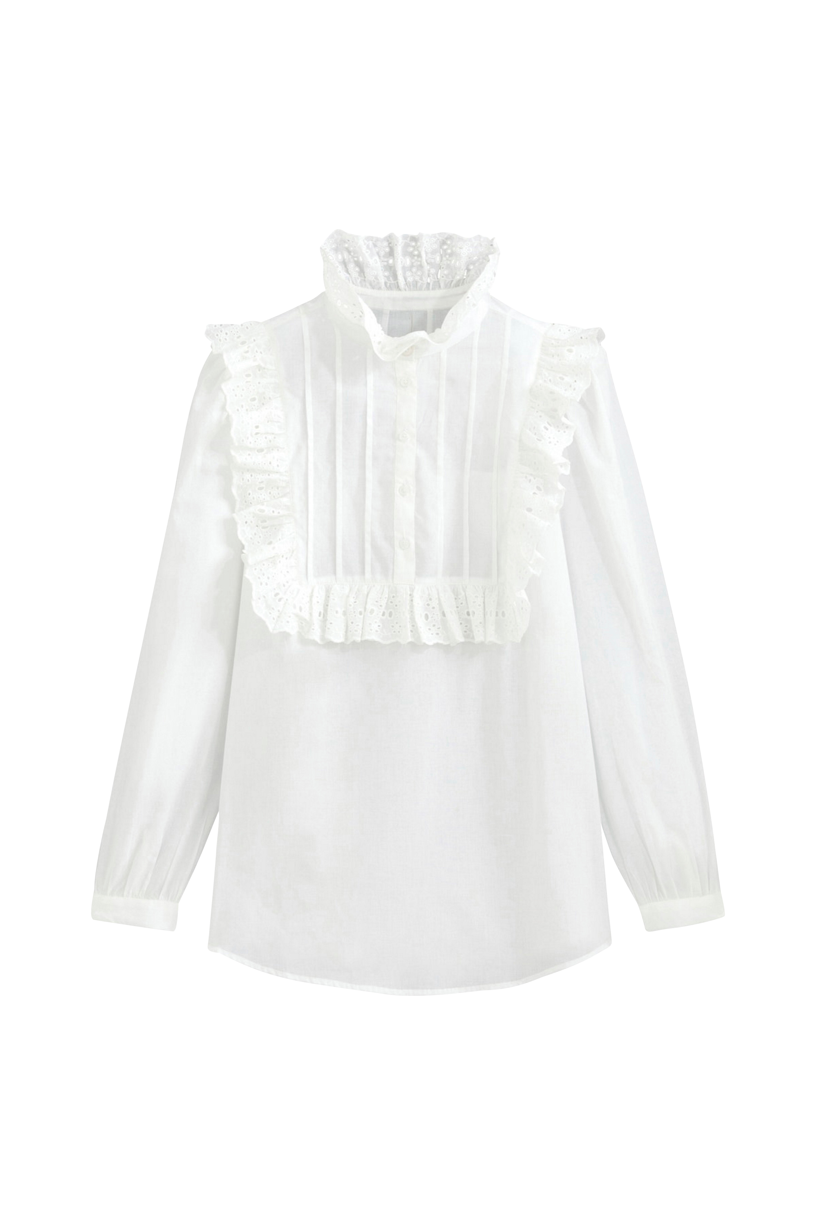 Blus i vintageinspirerad, trendig modell. Romantisk, kvinnlig modell med infällning med volang fram. Detaljer - Lång ärm - Ståkrage Material och skötselråd - 100% bomull - Maskintvätt 30° - Stryks på medeltemperatur / tål ej blekmedel - Tål ej torktumling - Tål ej kemtvätt Ytterligare information - Bomullspoplin - Halv knäppning fram - Vintageinspirerad modell med volanger och engelsk brodyr - Infällning med volang med engelsk brodyr fram - Lång ärm med manschett och knapp - Längd 71 cm i storlek 38