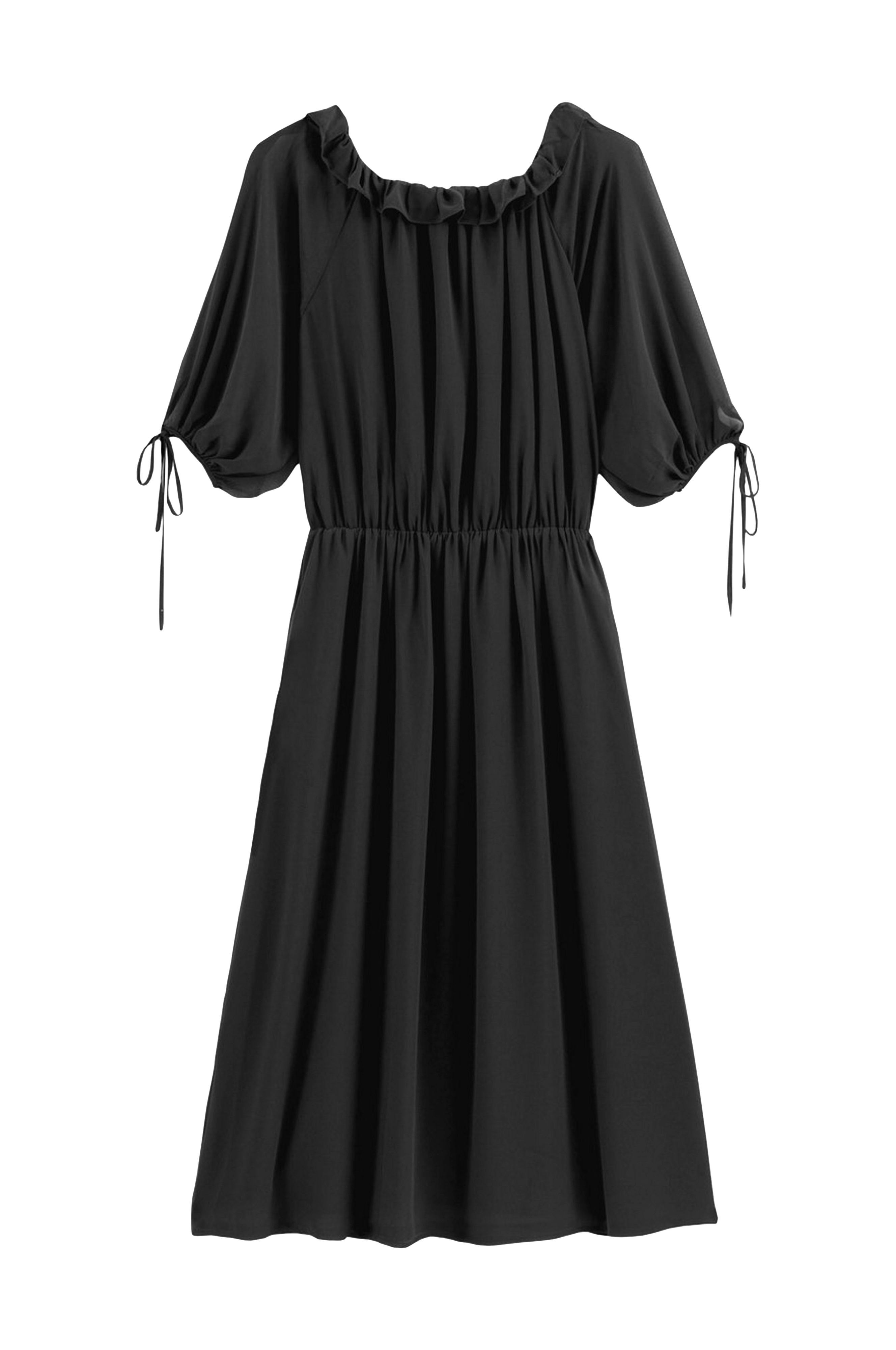 Klänning i modern, kvinnlig modell med volang i halsringningen, markerad midja och vida ärmar.