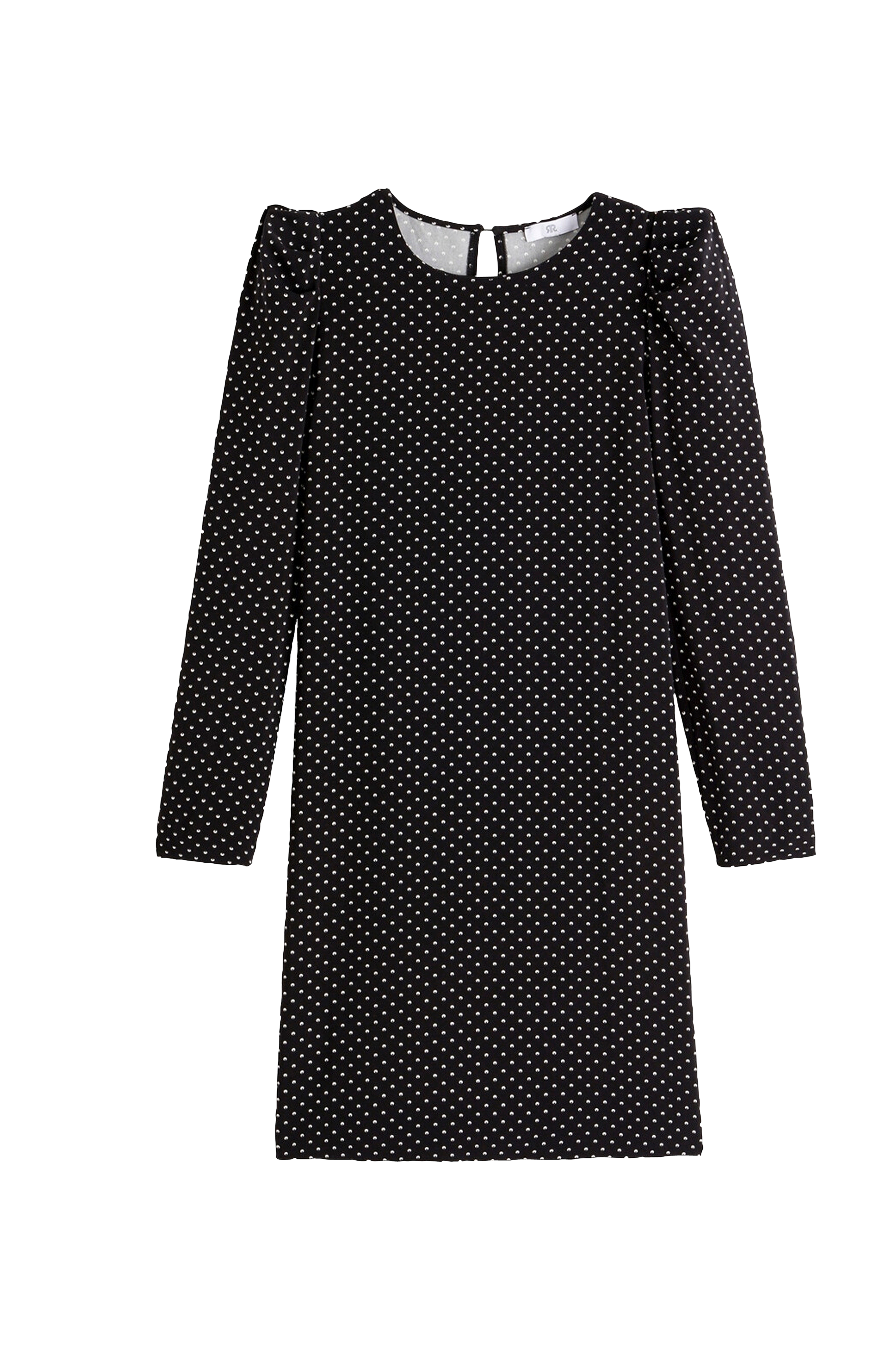 Stilfull klänning med prickigt mönster. Trendig modell med rak passform och rynkad ärmkulle. Detaljer - Rak modell - Kort modell - Lång puffärm - Rund halsringning med droppformat sprund bak - Prickigt mönster - Längd 90 cm i storlek 38 Material och skötselråd - 89% polyester, 11% elastan - Maskintvätt 30° - Stryks på låg temperatur / tål ej blekmedel - Tål ej torktumling - Tål ej kemtvätt Ansvarsfull produkt - Välj en produkt med Oeko-Tex® märkning STANDARD 100, så väljer du en textil produkt som inte är skadlig eller irriterar huden. En internationell och oberoende märkning som skyddar konsumenternas hälsa. Den är både hälsosam och hållbar.