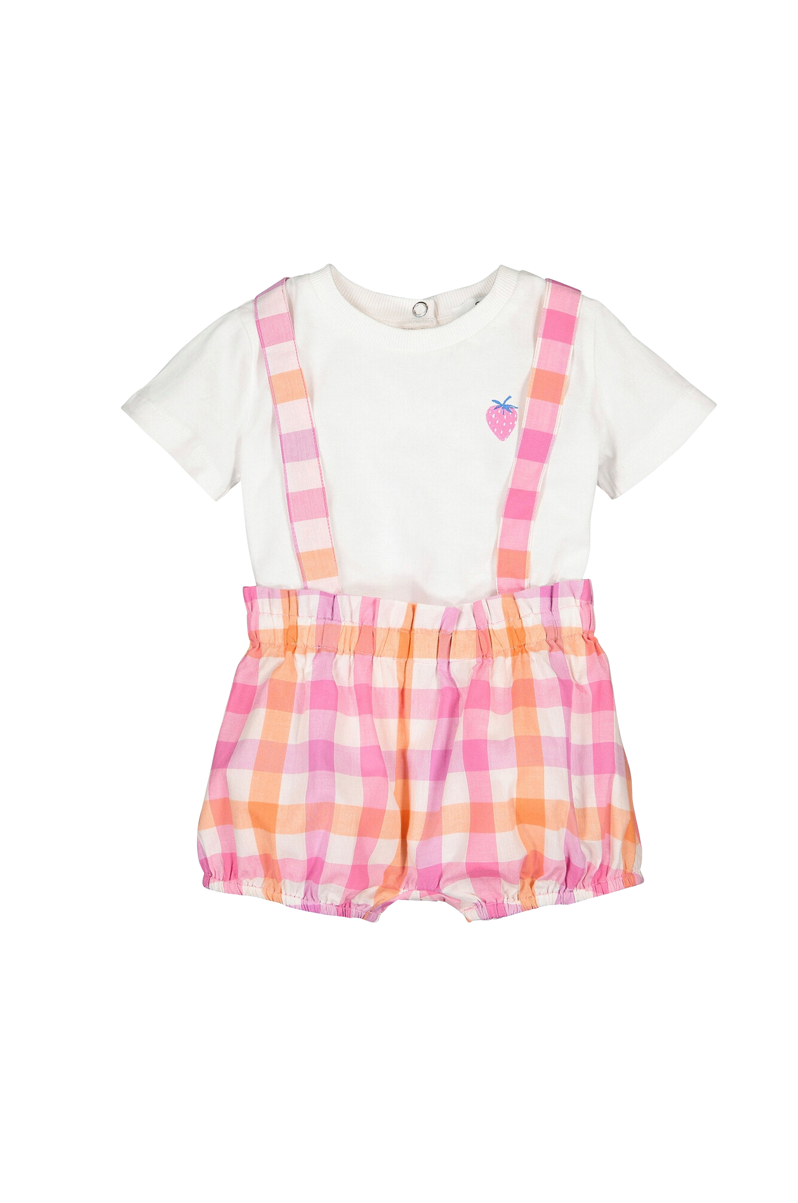 Set med tröja med kort ärm och rutig byxa med avtagbara hängslen. Detaljer - Tröja med rund halsringning - Kort ärm - Tryckt jordgubbsmotiv på bröstet - Öppning med tryckknappar till halva ryggen - Byxa med avtagbara hängslen som korsas bak - Rutigt mönster - Resår i midjan - Resår i benskärningen Material och skötselråd - Huvudsakligt material: 100% bomull - Övrigt material: 100% bomull - Övrigt material 2: 95% bomull, 5% elastan - Maskintvätt 40° - Stryks på låg temperatur / tål ej blekmedel - Torktumling på låg temperatur - Tål ej kemtvätt