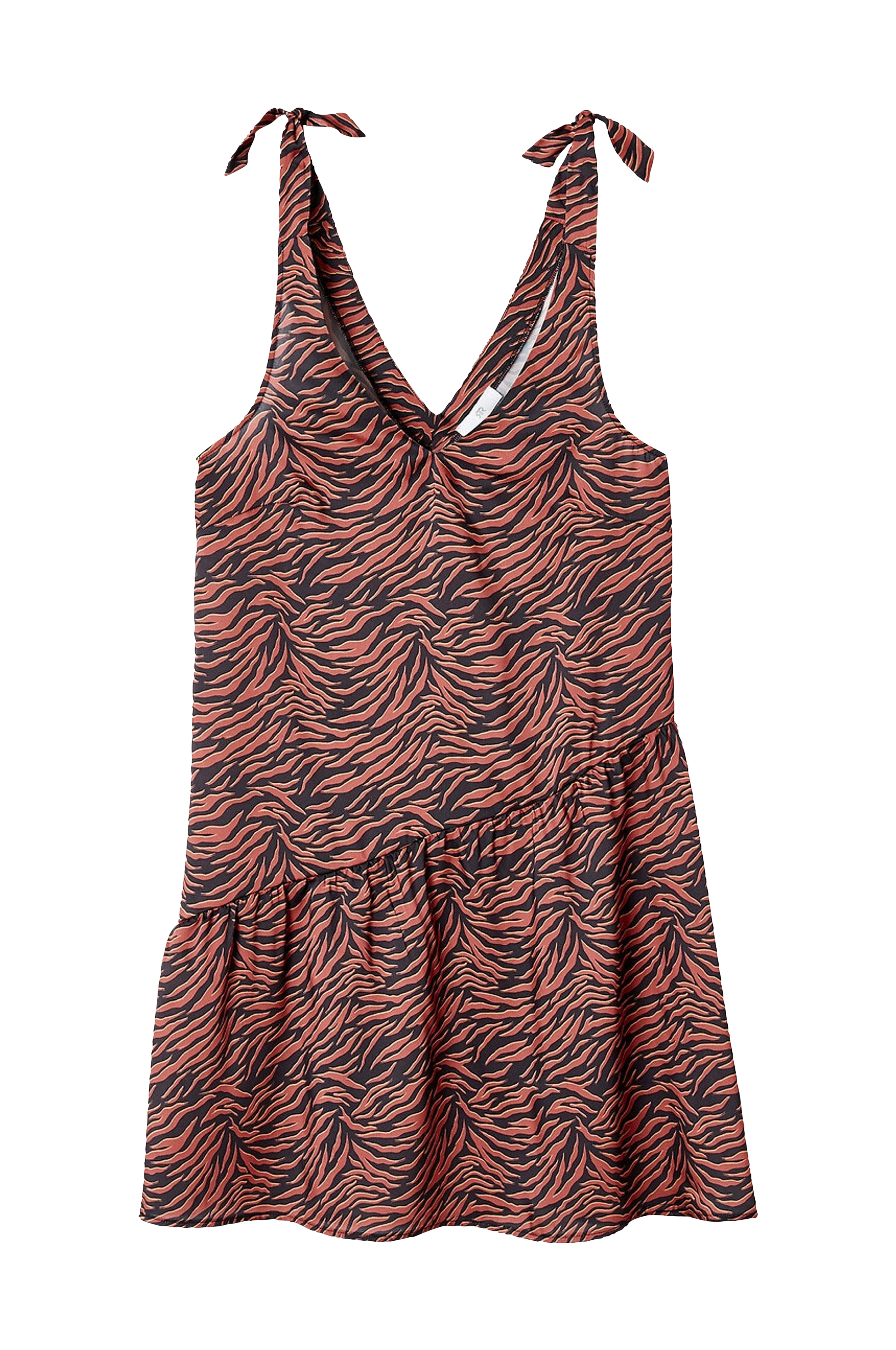 - Utställd modell - Kort modell - Smala axelband som knyts upptill - V-ringning - Djurmönster
