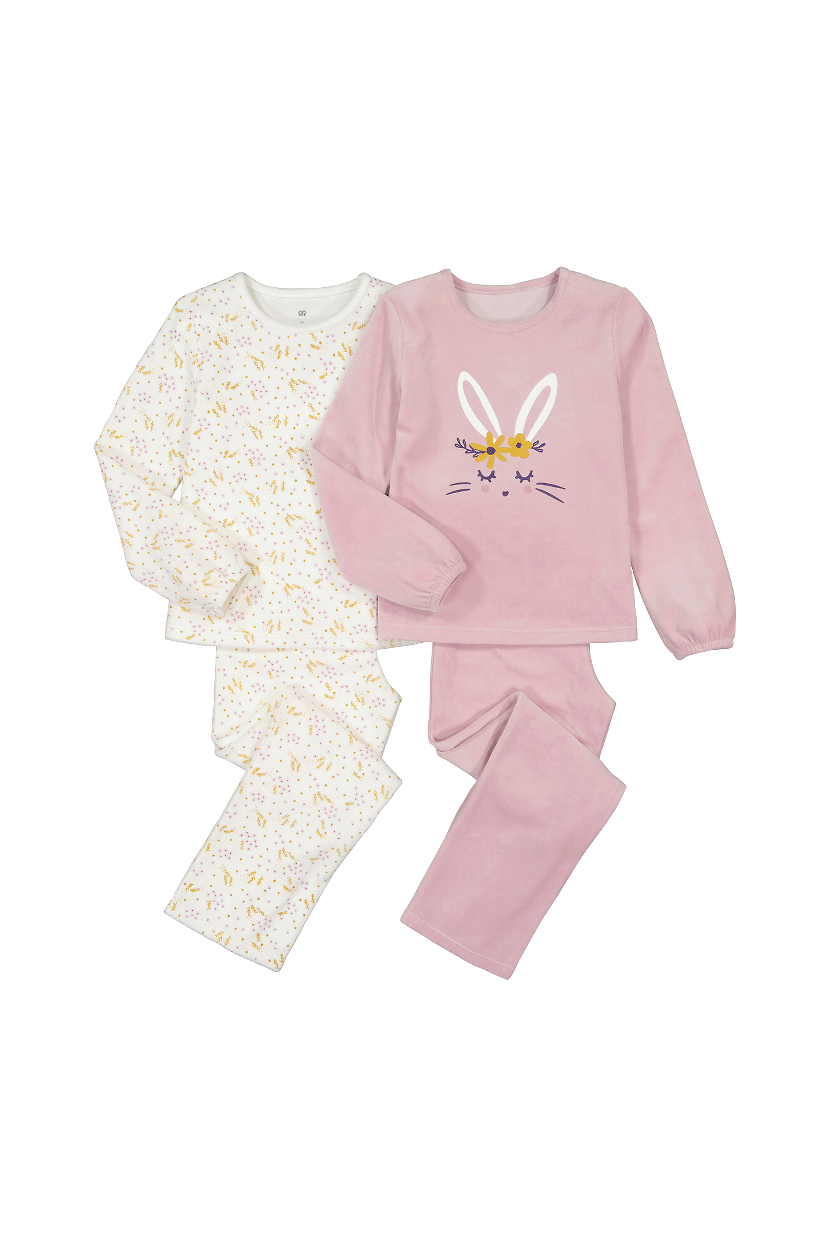 - Förpackning med 2 pyjamasar: 1 med blommönster och 1 enfärgad med en kanin tryckt på ovansidan
