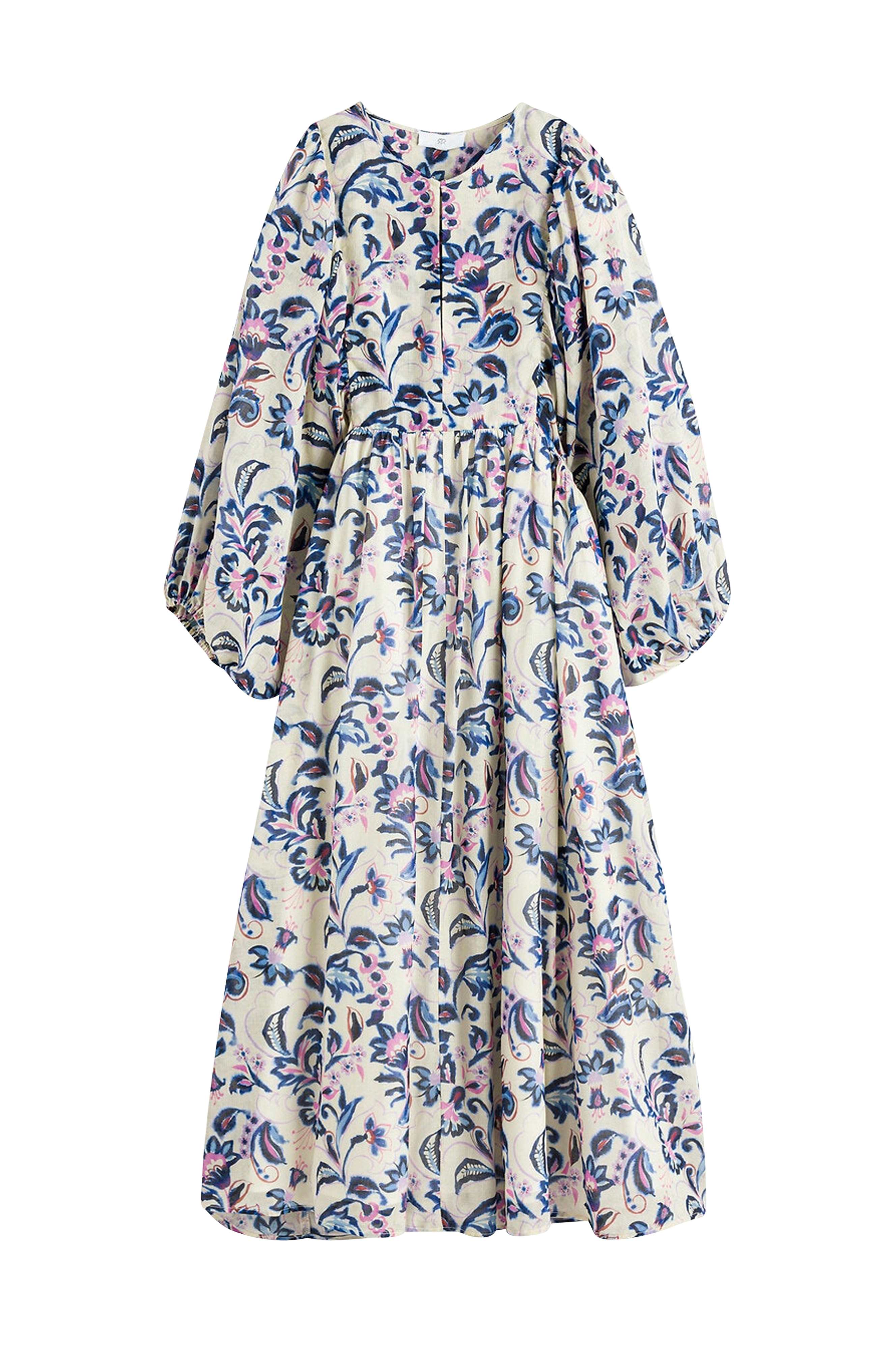 Blommönster, utställd modell och puffärm. Romantisk modell i bohemstil. Detaljer - Utställd modell - Midilängd - Trekvartslång ärm - Rund halsringning med hyska - Skärning i midjan - Tryckt mönster - Bomullsvoile Produktens mått i storlek 38/M - Längd: 120 cm - Ärmlängd: 54 cm