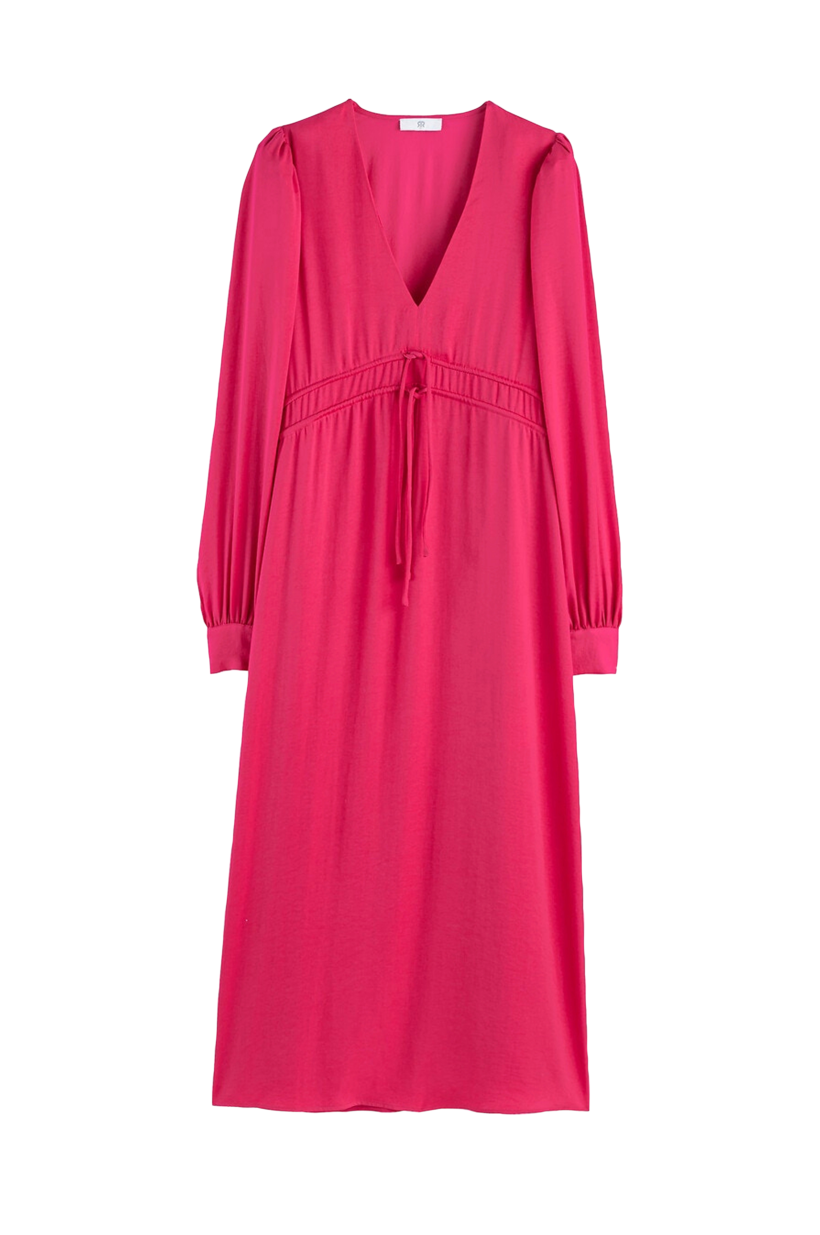 Lång klänning i elegant stil. Smickrande V-ringning och utställd passform. Kvinnlig modell med dragsko och knytband som markerar midjan. Detaljer - Utställd modell - Lång modell - Lång ärm - V-ringning - Dragsko med knytband i midjan - Sprund nedtill i sidorna Produktens mått i storlek 38/M - Längd: 128 cm - Ärmlängd: 68 cm