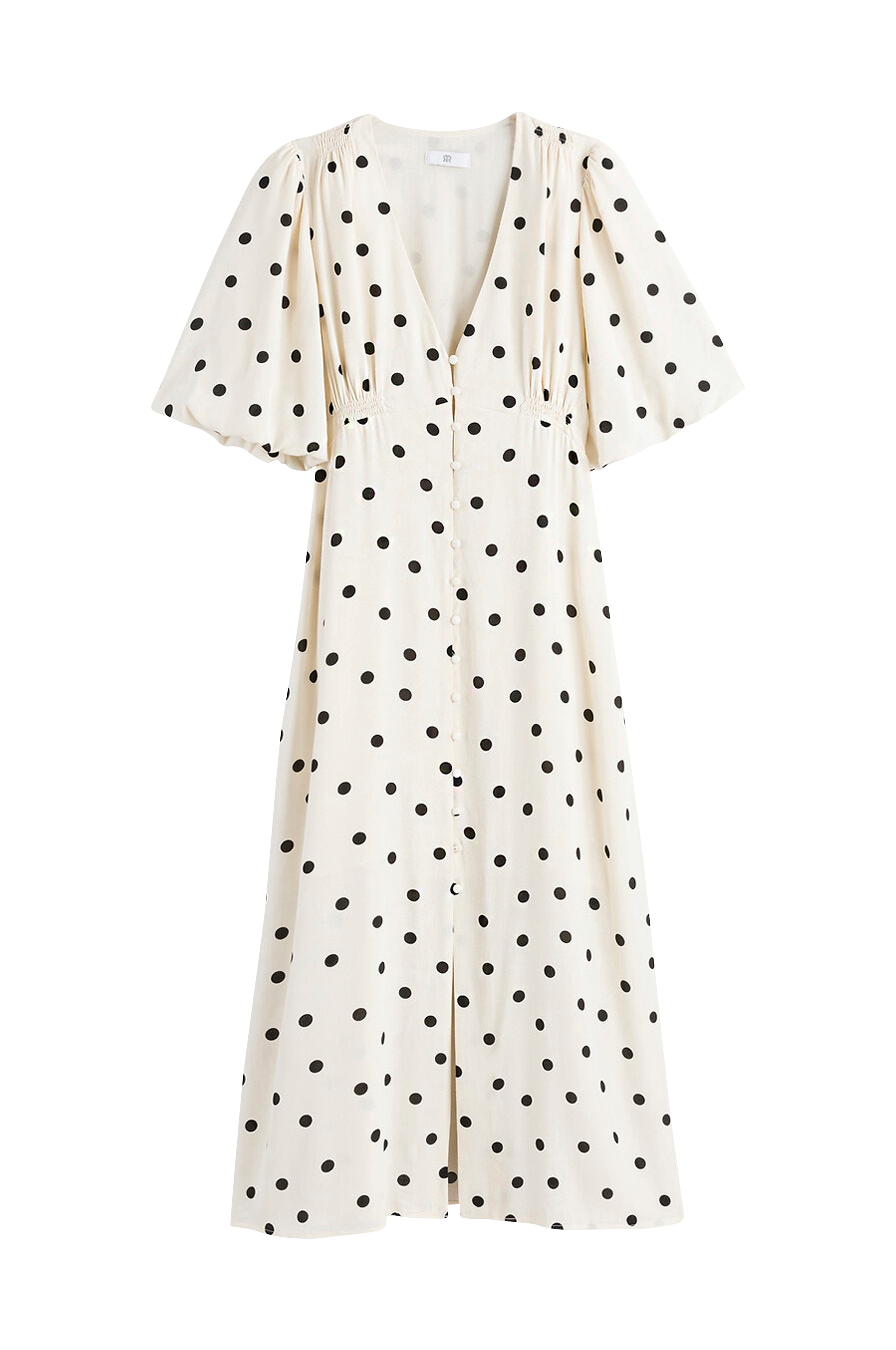 Midiklänning i elegant modell med markerad midja, vacker halsringning och puffärm. Ett perfekt basplagg i ECOVERO™ viskosmaterial. Detaljer - Utställd modell - Midilängd - Kort puffärm - V-ringning - Dragkedja i sidan - Sprund fram - Prickigt mönster Produktens mått i storlek 38/M - Längd: 125 cm - Ärmlängd: 38 cm